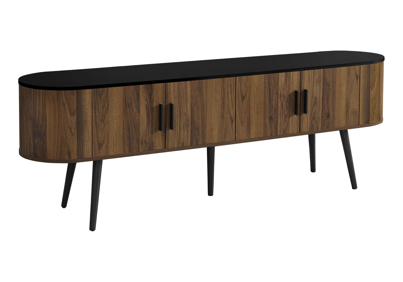 Elevate your living space with this stunning 72 inch long tv stand in a chic two tone finish. With an easy to clean top in a black laminate and 4 cabinet doors in a wood-look walnut laminate, this console offers ample storage for an organized media entertainment center. The curved sides and sleek handles in black add a touch of retro style, while the black solid wood legs provide durability and stability. Designed with 2 hidden cable management holes behind the closed storage, this tv stand keeps your entertainment area looking neat and clutter-free. The durably designed piece is easy to assemble with step by step illustrated instructions and all the necessary hardware included. Perfect for the fashion-forward customer looking to add a contemporary or mid-century flair to their bedroom or living room. Backed by a 5 year limited warranty, this solidly constructed storage cabinet is not only functional but brings fashionable style for the trendiest decors.