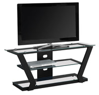 Modernize your space with this contemporary black metal TV stand that accommodates up to a 48"L flat panel television. Featuring solid, durable tempered glass shelves and a sleek black metal frame, this tv console will fit perfectly in your living room, den, tv room or basement. The chic angled design of the frame gives a clean, sophisticate look while you entertain your guests. With ample surface area for all of your entertainment accessories and a convenient cord management system to reduce unsightly wires this tv stand will have you organized in no time.