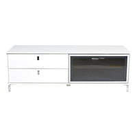 - Material: High gloss lacquer, tempered glass, high polished steel metal legs - Finish: White - Style: Modern - With 1 pull-down glass door on one end and 2 drawers on other end.