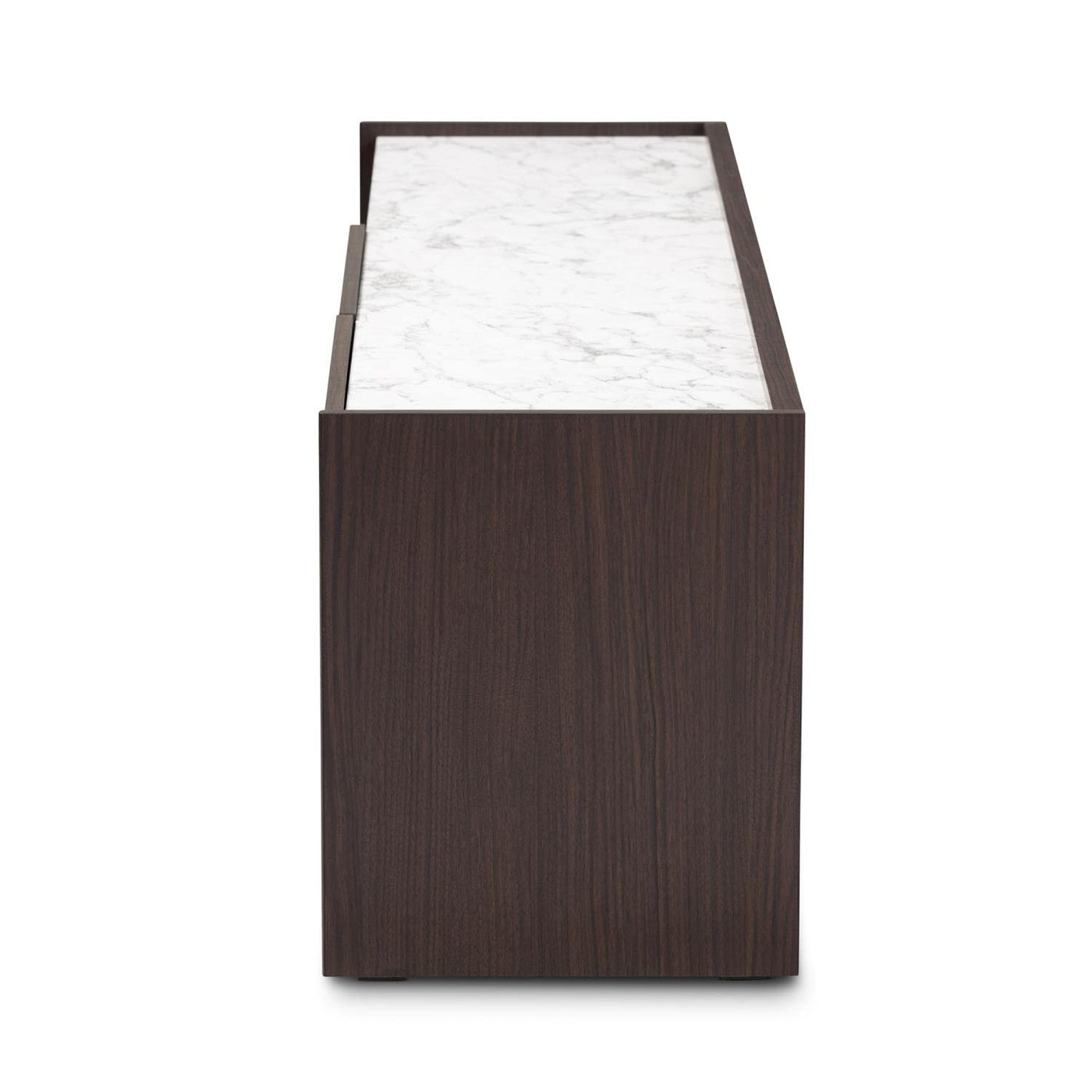 The sleek, modern flair of the Walker TV stand creates a stunning focal point in your living room. Made in Malaysia, the Walker radiates rich wood tones with its dark brown finished frame. Two open shelves conveniently organize media devices, while two large shelves behind the doors offer secure storage space. Requiring assembly, the Walker features a touch of gold, as well as a faux marble top, for luxurious accents steeped in modern glamour. A convenient cord management hole on the back panel allows for easy setup. With its radiant design and flexible convenience, the Walker TV stand is a superb addition to any space.