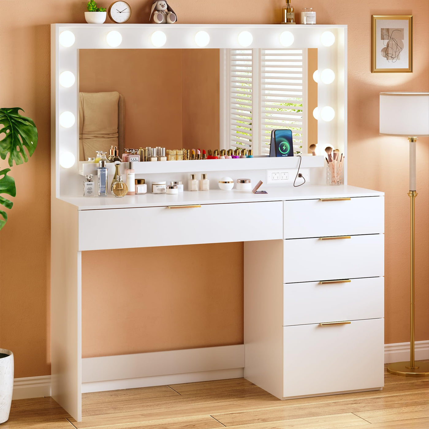 This modern vanity with large mirror and 5 drawers, with great room to store cosmetics, skincare, and hair tools.Features:Featuring a large cosmetic mirror, our vanity desk provides a wider view and makes makeup application easier. Its versatility allows it to be used at home, work, hair salons, or studios, making it perfect for various makeup needs. Comes with built-in charging station, easily connect your hair dryer, mobile phone, curling iron, and other beauty tools without the hassle of searching for available outlets. Makeup Vanity Table comes with 13 light bulbs to provide sufficient and soft light, flexible and easy to switch between different lights.Product InformationPrimary Material:MDFColor:WhiteDrawer: 5Power Outlet: 2 Standard Plug Outlets & 2 USB Ports3 Lighting Modes: Warm Yellow, Warm White, Cold WhiteTable Size:15.7D x 39.3W x 54.9H