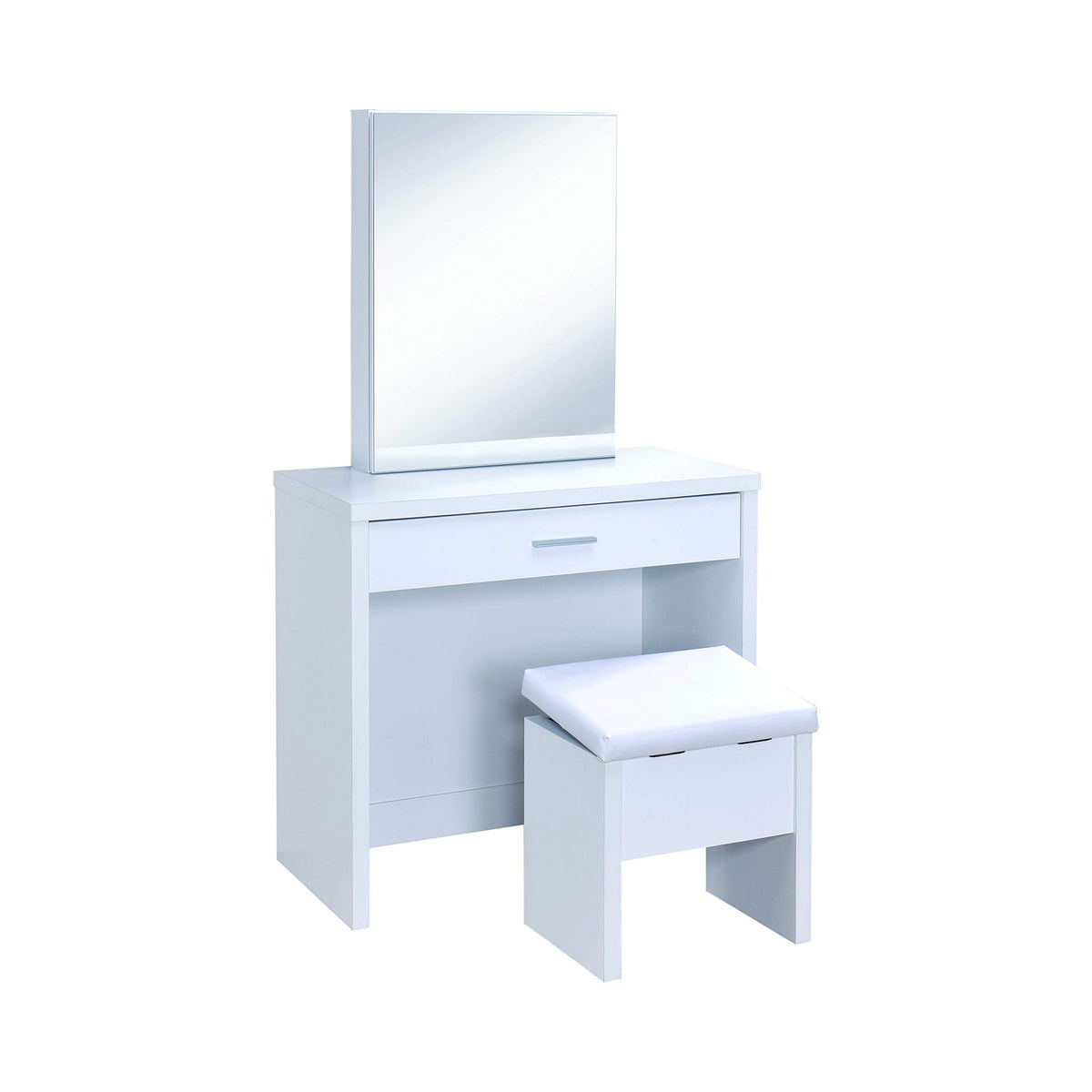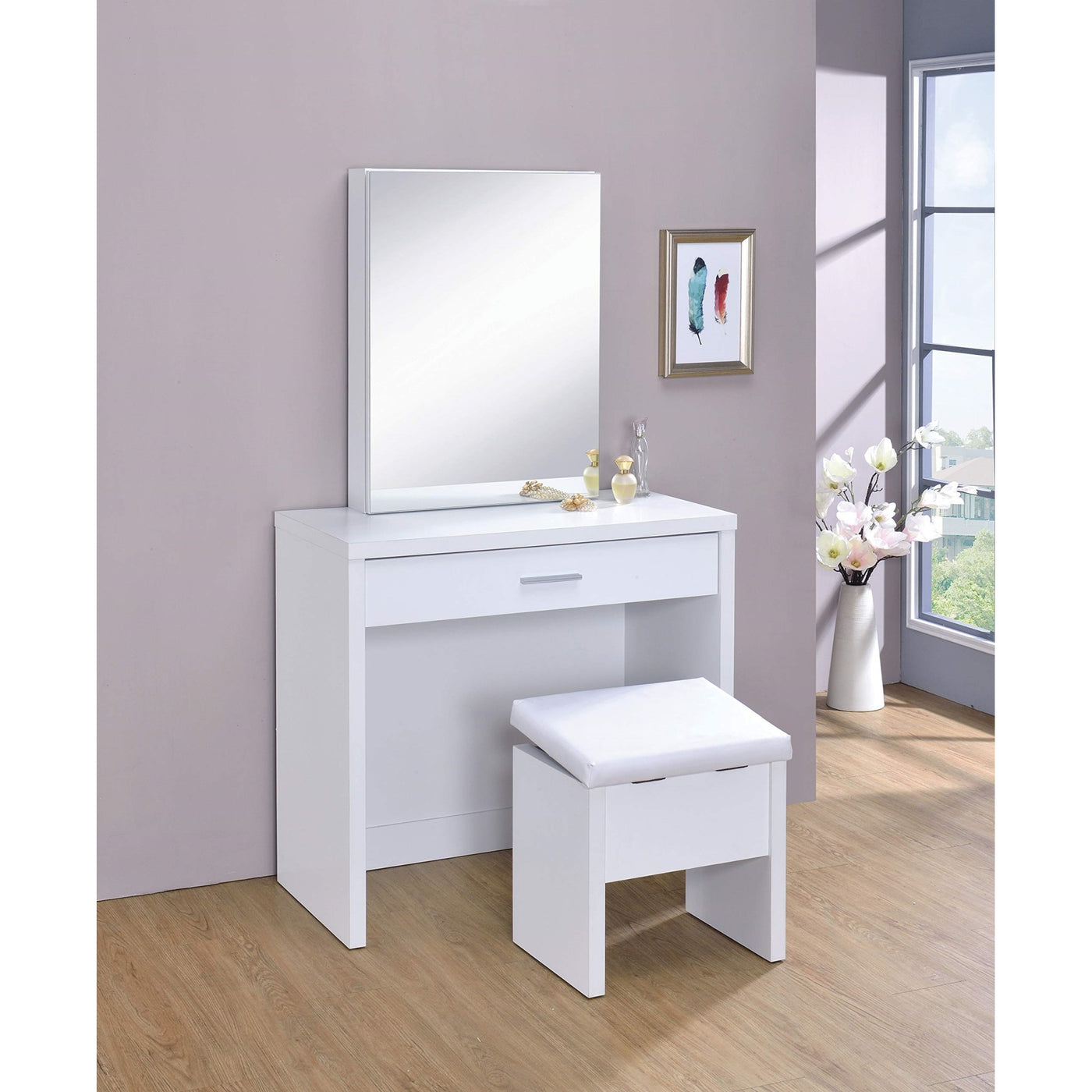 Coaster Home Furnishings Harvey Contemporary 3-Piece 1-Drawer Makeup Vanity Desk With Jewelry Storage Vanity Mirror And White Faux Leather Upholstered Storage Vanity Stool White 300290