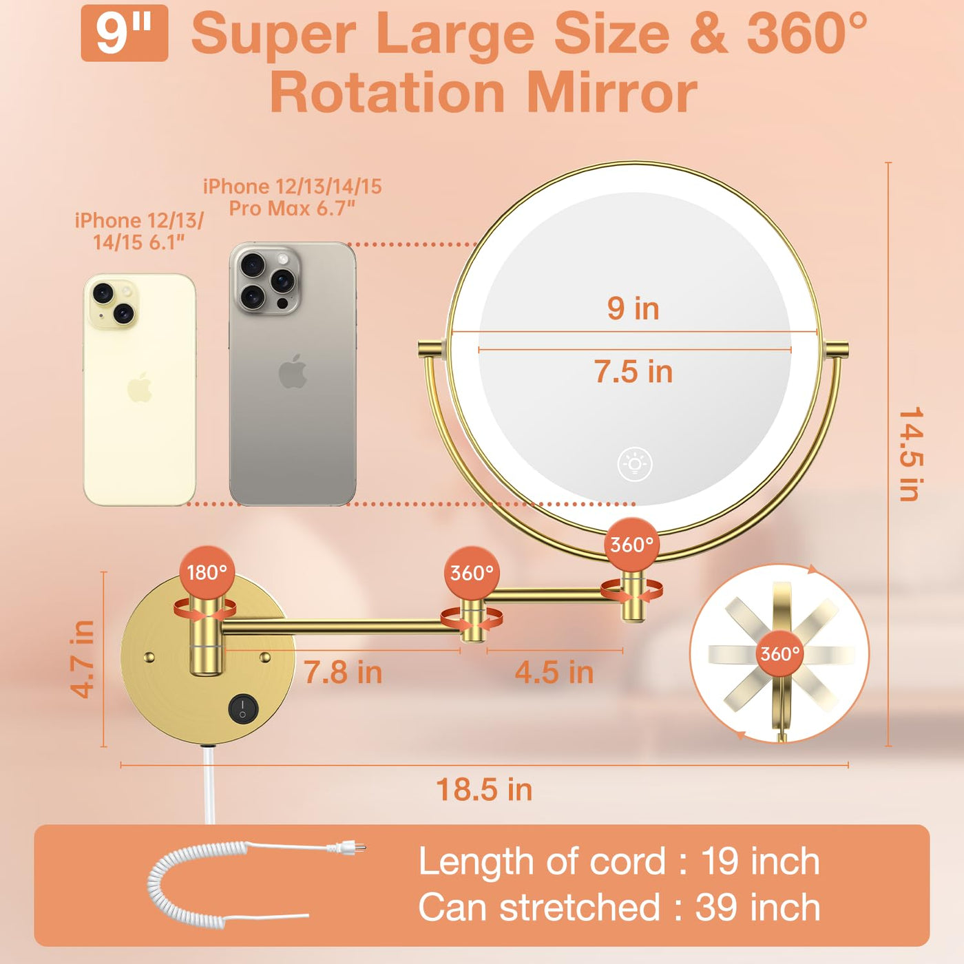Benbilry 9 Wall Mounted Lighted Makeup Vanity Mirror With 3 Color Dimmable Lights, Super Large 1X/10X Magnifying Double Sided Led Cosmetic Mirror, 360 Swivel Extendable Round Shaving Mirror Gold