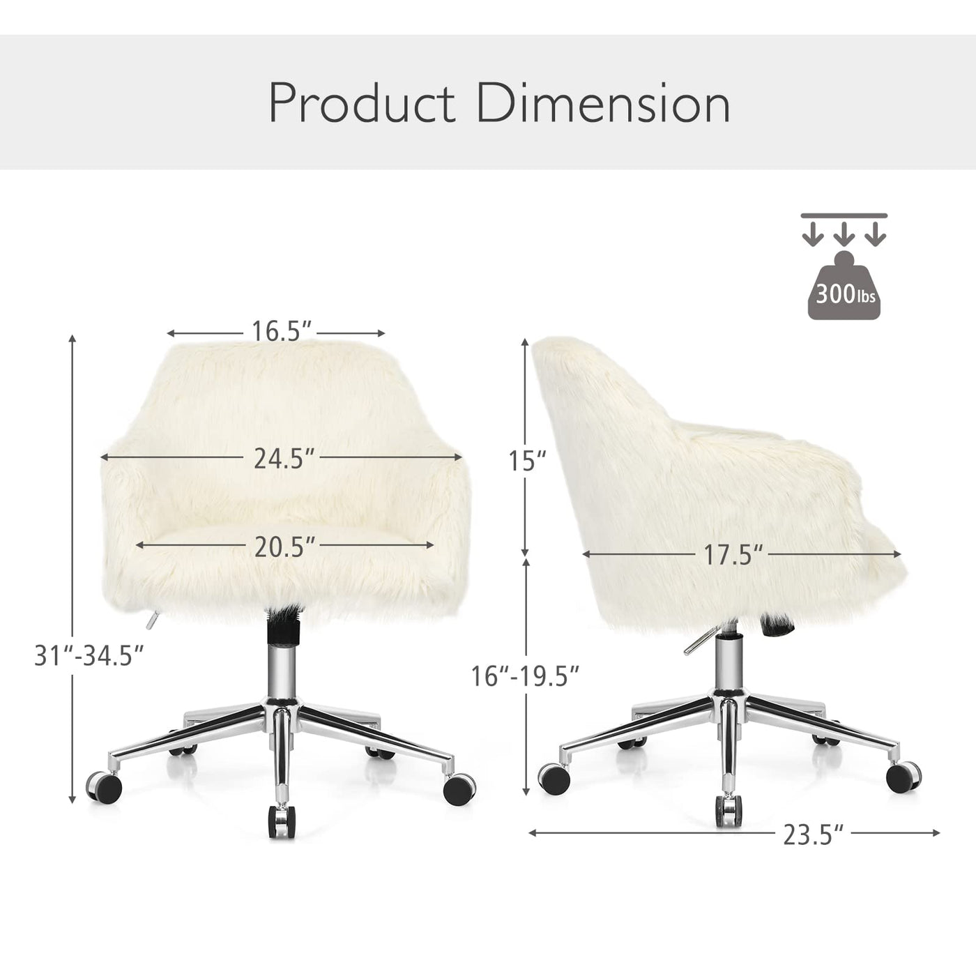 Specification Color: Beige Material: Metal, Faux Fur, Sponge, PP Product Dimension: 24.5' x 23.5' x 31'-34.5'(L x W x H) Seat Cushion Dimension: 20.5' x 17.5'(L x W) Seat Height: 16'-19.5' Net Weight: 26 lbs Weight Capacity: 300 lbs Package Includes: 1 x Faux Fur Desk Chair, 1 x Instruction