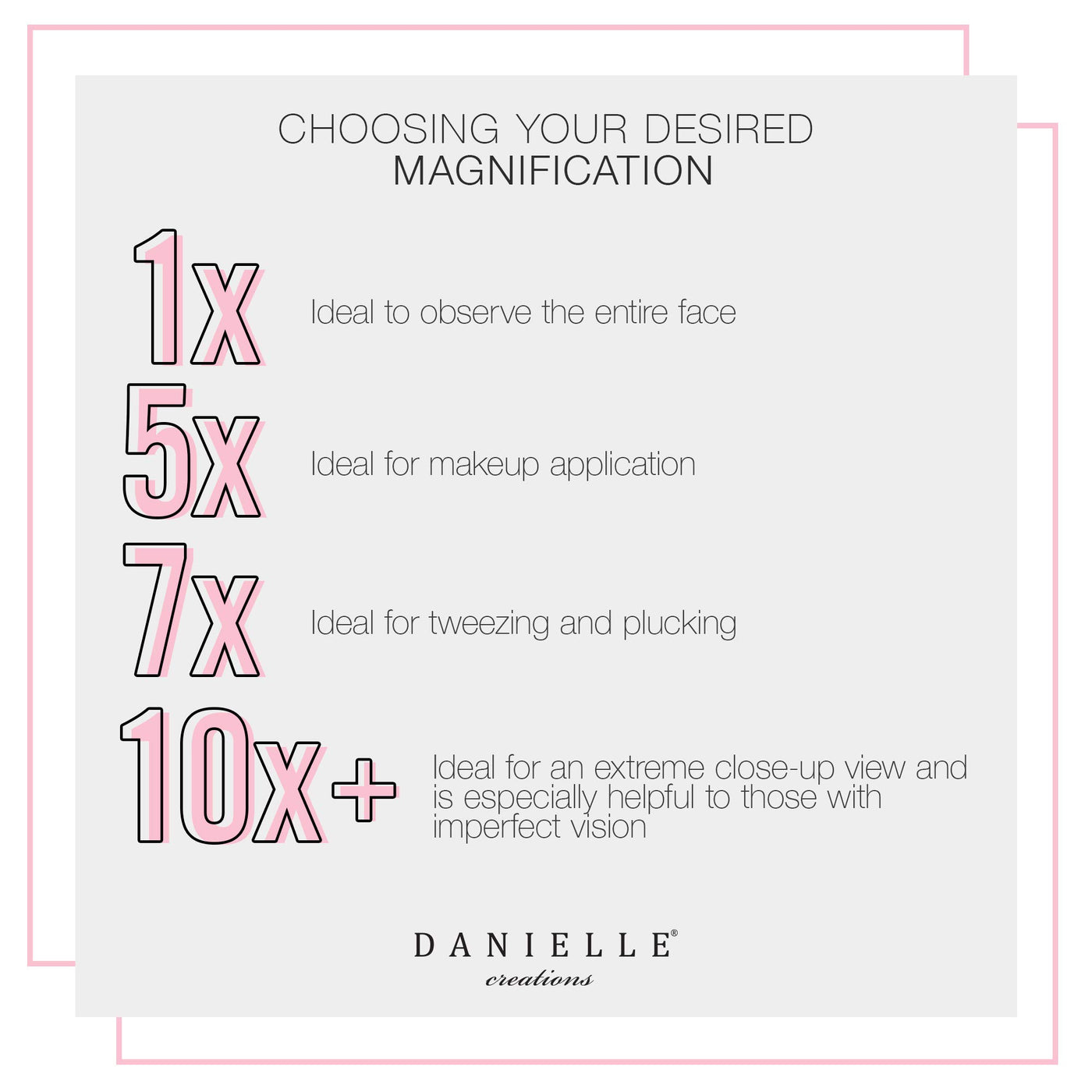 Q: What is the magnification level of the Danielle Creations Vanity Makeup Mirror?A: The Danielle Creations Vanity Makeup Mirror features a 10x magnification side, allowing you to achieve precise results when applying makeup, tweezing eyebrows, or inspecting your skin closely.