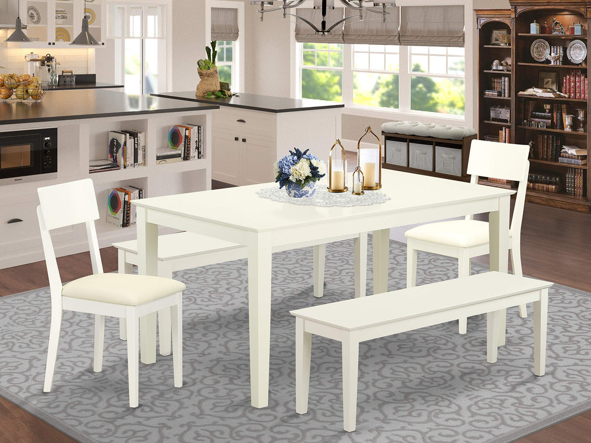 East West Furniture - Caad5C-Lwh-Lc - 5-Piece Dining Table Settransform Your Dining Room Into A Sophisticated Space With This Exceptional Rectangular Dining Table Set. Crafted To Perfection, This Kitchen Nook Table Set Comes Complete With 2 Elegant Kitchen Dining Chairs, Two Outstanding Benches, And A Stylish Dining Room Table, All Designed To Enhance The Overall Elegance Of Your Kitchen. This Linen White Rectangular Kitchen Table Offers The Perfect Platform To Enjoy Breakfast, Lunch, Or Dinner With Your Family And Friends, All While Basking In The Luxurious Comfort Of Its Modern Dining Chairs, Which Feature Comfortable Pu Leather Seats And Wooden Slat Backs, Providing Exceptional Support And A Comfortable Sitting Experience. The Hardwood Bench And Rectangular Tabletop, Supported By A Sturdy 4-Legged Structure, Add To The Set'S Overall Charm And Sophistication. Meticulously Handcrafted By Highly Skilled Carpenters, This Mid-Century Dining Table Set Boasts A Luxurious Finish And A Superior Quality That Is Unmatched. Built From Top-Quality Asian Hardwood, Commonly Known As Rubber Wood, This Wood Dining Table Set Offers Unmatched Durability And Stability. Assembly And Cleaning Of These Dining Room Table Sets Are Effortless, And With Any Fine Cleanser, You Can Keep This Dining Set Looking Brand New For Years To Come.Product Features: Chair Seat: Faux Leather Frame Color: Linen White Table Legs: 4 Legs Table Top: Rectangular Dimensions Of Dining Table: Length: 60; Width: 36; Height: 30. Measurement Of Dining Room Chairs: Length: 21; Width: 17; Height: 36. Size Of Bench: Length: 51; Width: 15; Height: 18.Package Include: A Modern Dining Table, 2 Wooden Dining Chairs, And 2 Bench