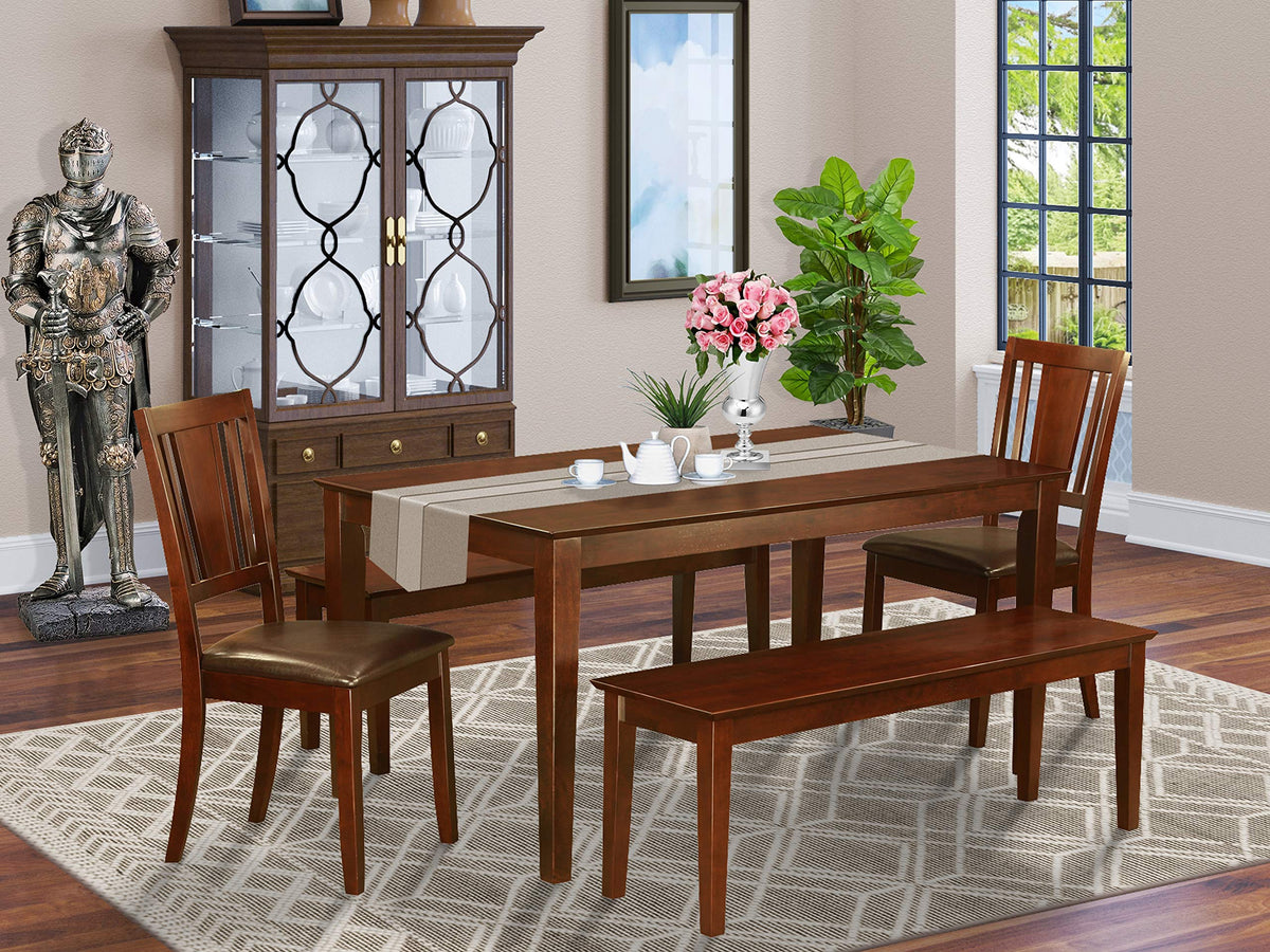 EAST WEST FURNITURE - CADU5C-MAH-LC - 5-PIECE DINING TABLE SETEnhance the beauty of your dining room with this beautiful kitchen set that includes 2 wooden dining chairs, 2 gorgeous benches, and a fantastic small table. The timeless design of this kitchen set adds elegance to your dining room decor. The kitchen chairs are built with high-quality PU leather that offers complete comfort and an amazing sitting experience. The dining set features a Mahogany hardwood small table and bench, with a lovely dining room chair with Faux Leather seat and Panel back, adding elegance to your dining room and enhancing its beauty. The kitchen set delivers great durability as it is built with Asian wood, also known as Rubberwood. Highly experienced carpenters have created these kitchen dining chairs, classic bench, and small dining table, ensuring a smooth and high-end finish. Assembling these classy dining chairs, bench, and kitchen table is easy if you follow the instructions provided in the package. The wood dining table set is easy to clean, and you can use any furniture cleaner to maintain its fresh look. The small dining table set is simple to clean and always provides a clean and fresh appearance.PRODUCT FEATURES: Fabric: PU Leather Wood Color: Mahogany Dining Table Dimension: Length: 60; Width: 36; Height: 30. Dining Chairs Dimension: Length: 21; Width: 17; Height: 38. Kitchen Bench Dimension: Length: 51; Width: 15; Height: 17.Package Include: 2 Dining Chairs, 2 Benches, And A Dining Table.