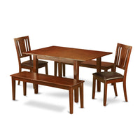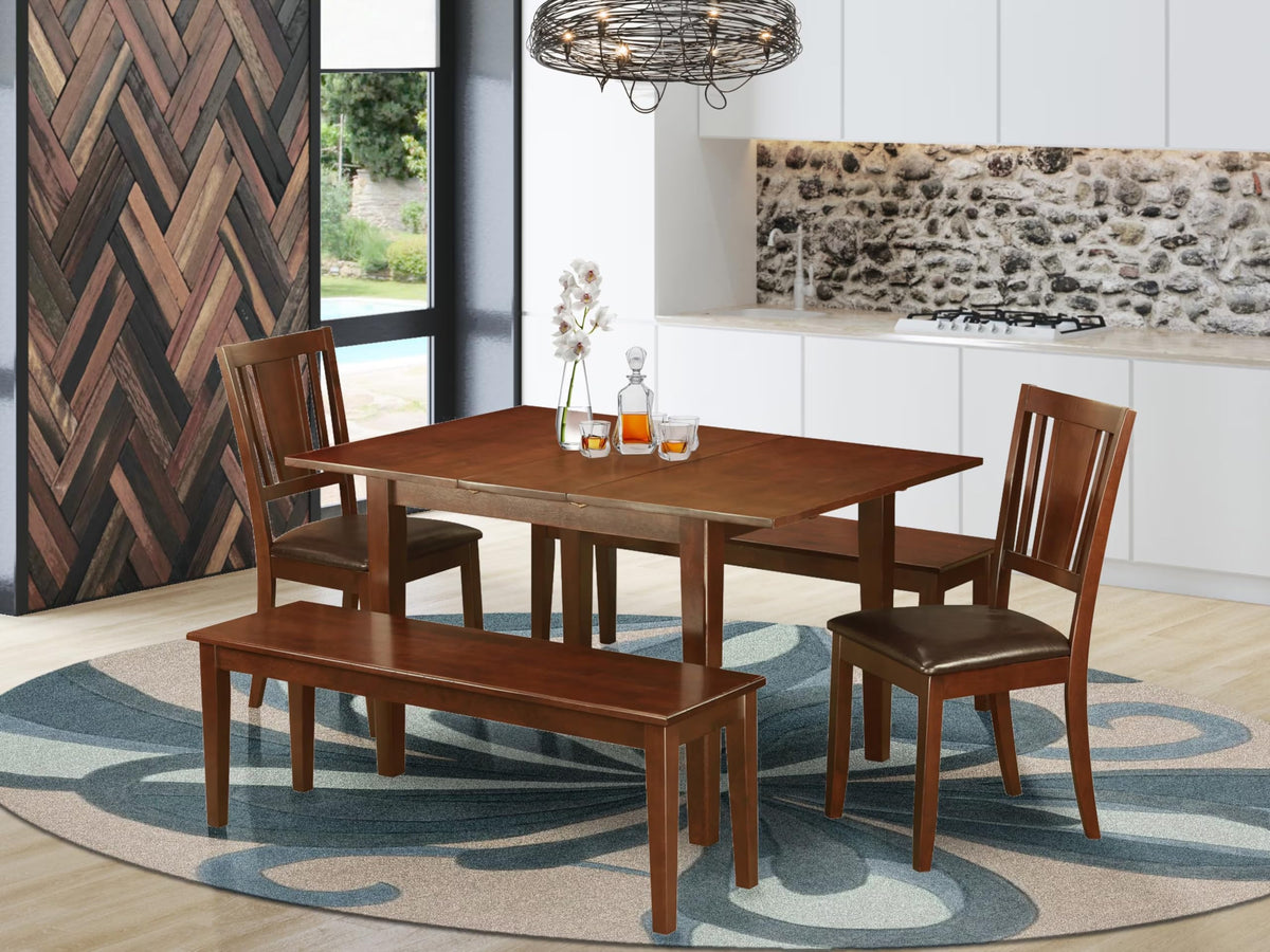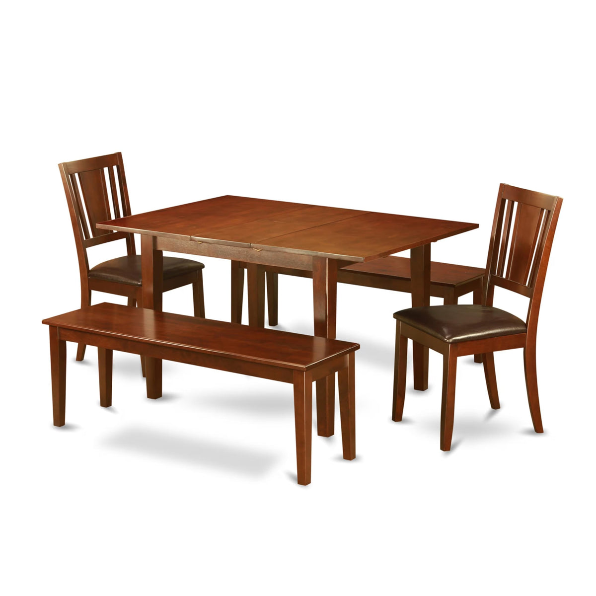 EAST WEST FURNITURE - MLDU5D-MAH-LC - DINNER TABLE SETThis dining table set is composed of 5 pieces, which include 2 contemporary dining chairs, 2 kitchen benches, and a dining table with a butterfly leaf. The kitchen table set showcases an exquisite Mahogany finish that is evident in every detail, from the tabletop to the carefully crafted wooden legs. The modern chairs feature luxurious PU Leather seats and matching Mahogany finished legs, adding a touch of inventive elegance to any dining area. Crafted in a mid-century style, this kitchen set is meticulously made from rubberwood, a highly regarded Asian wood known for its exceptional quality. The deliberate selection of this premium material guarantees unparalleled durability, making our dining set a symbol of long-lasting excellence. We have ensured both innovation and ease of assembly for our customers. By following the provided instructions, you can effortlessly assemble the self-storing butterfly leaf table, dining benches, and chairs. If you encounter any difficulties during the assembly process, please feel free to reach out to us for assistance. You can purchase our products with confidence, as customer satisfaction is our utmost priority.PRODUCT FEATURES: Frame Material: Asian Wood Frame Color: Mahogany Table Top Style: Rectangular Chair Back Style: Panel Chair Seat Material: Faux Leather Chair Dimensions: Length: 21; Width: 17; Height: 38. Table Dimensions: Length: 54/42; Width: 36; Height: 30. Bench Dimension: Length: 51; Width: 15; Height: 17.Included in the Package: 2 Dining Chairs, 2 Rectangular Benches and a Dining Table.