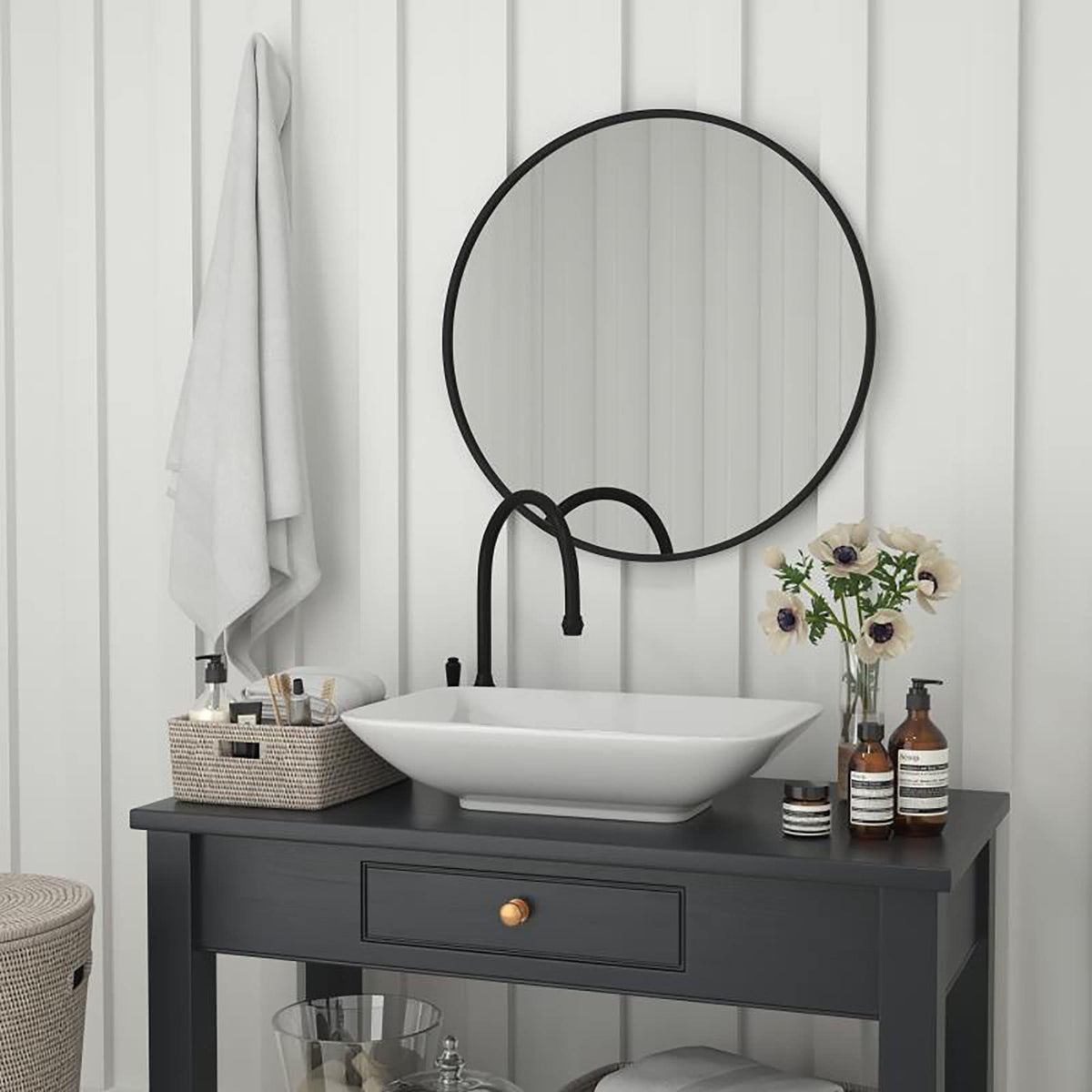 Give any room in your home an instant refresh with this round wall mount mirror. The modern design boasts a slim, matte black metal frame that lends an up-to-date look to almost any decor. HD glass with real silver backing provides high reflectivity for a distortion-free image. Safety should always be first, especially in environments with children and pets. Shatterproof backing technology ensures the glass stays put in the frame when breakage occurs to prevent cuts. The waterproof and rust-resistant design make this large mirror ideal for use in high humidity areas such as bathrooms, kitchens, and sheltered balconies. With three types of mounting hardware included installation of your new looking glass can begin as soon as you receive it and this mirror wipes clean with a damp cloth.