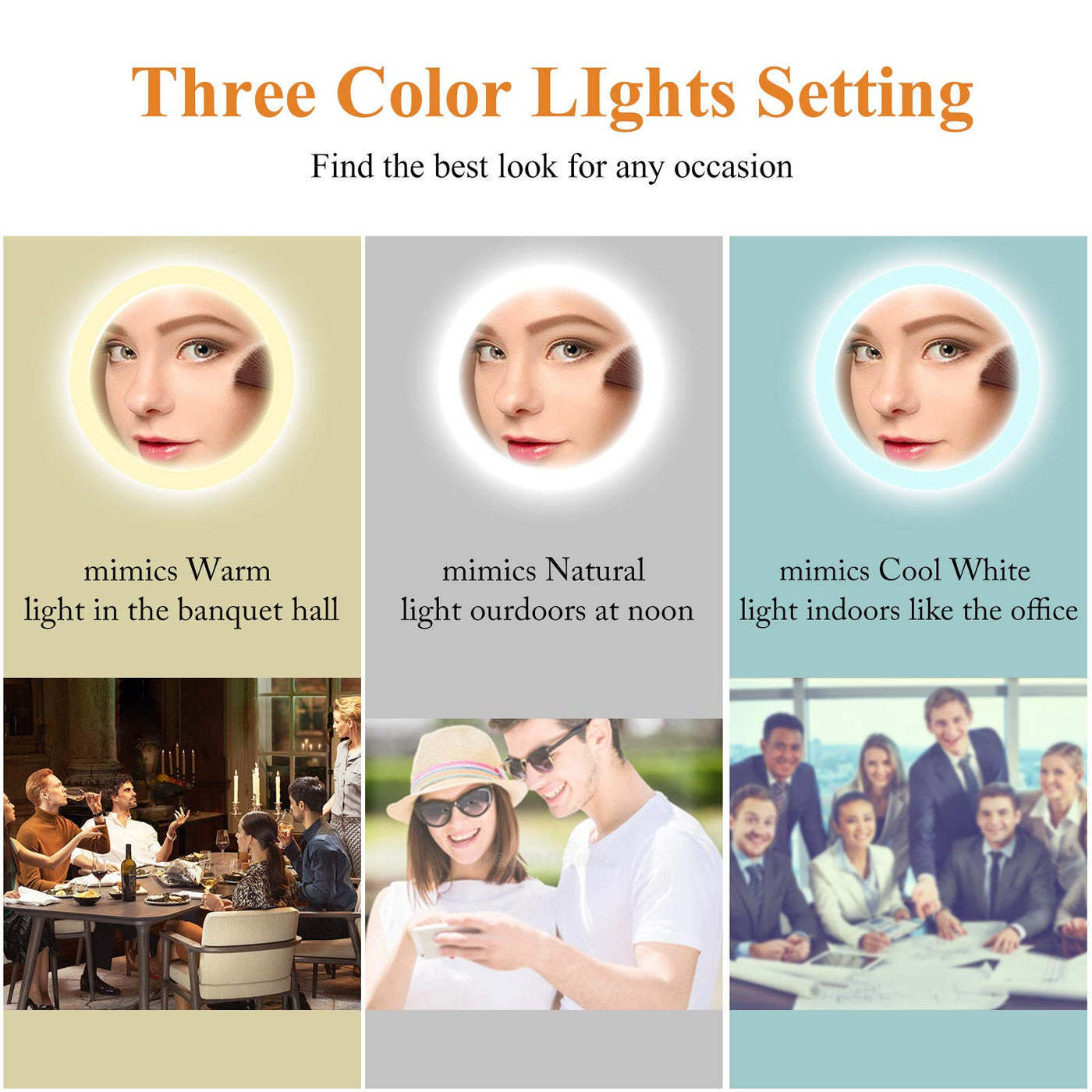 Q: How does the LED lighting work on this makeup mirror?A: The mirror is equipped with 50 LEDs that offer three adjustable color modes: Natural Daylight, Warm Yellow, and Cool Light. You can switch between modes by pressing the button on the base multiple times, with 25 LEDs illuminating at once for optimal visibility.