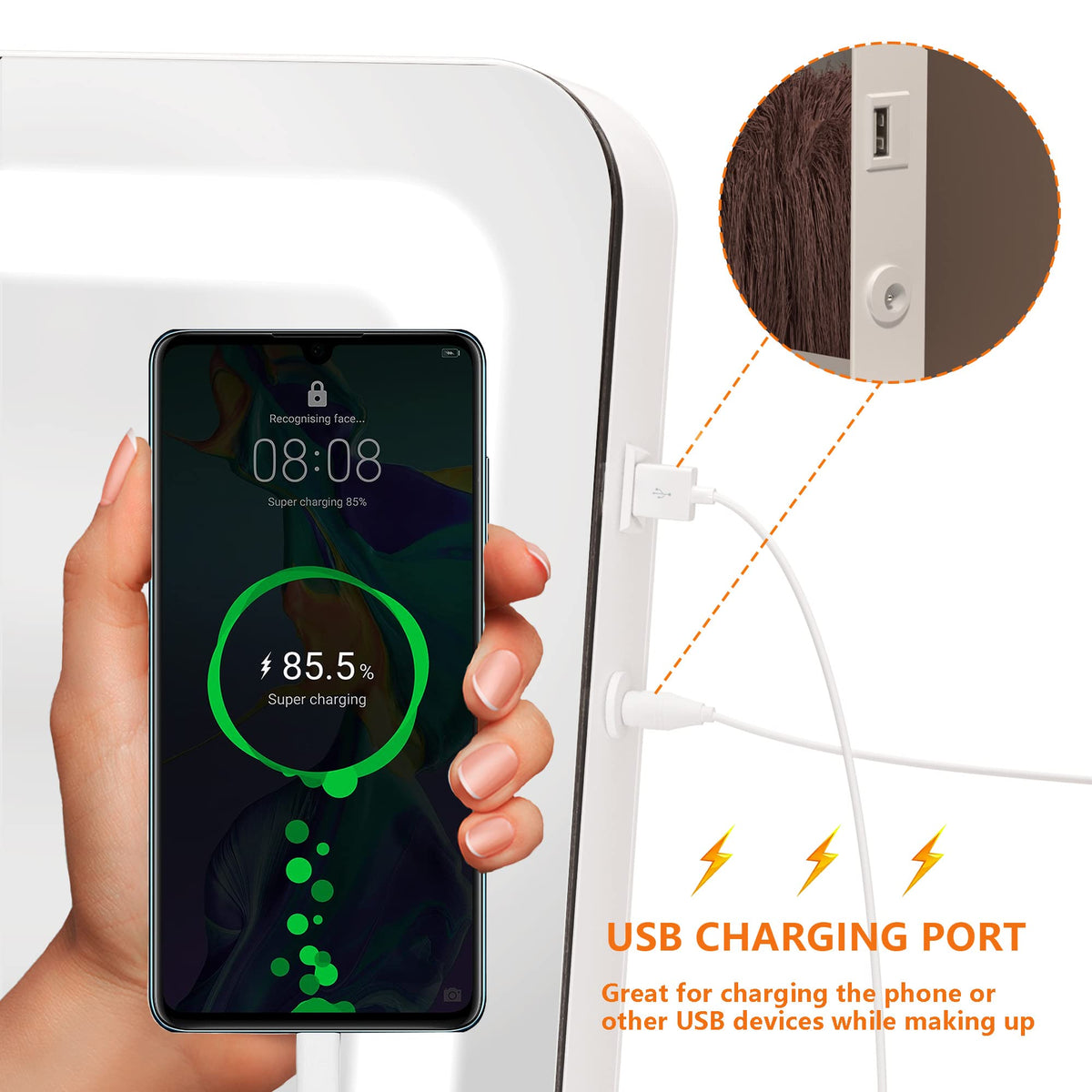 Q: Can I charge my phone using this mirror?A: Yes, this vanity mirror is equipped with a USB charging port, allowing you to conveniently charge your phone while getting ready.