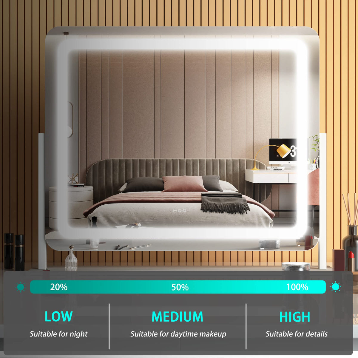 Q: Does the mirror have adjustable lighting options?A: Yes, the mirror features smart touch controls that allow you to choose from three different color temperatures: warm, cool, and natural light, which can be dimmed to suit your needs.