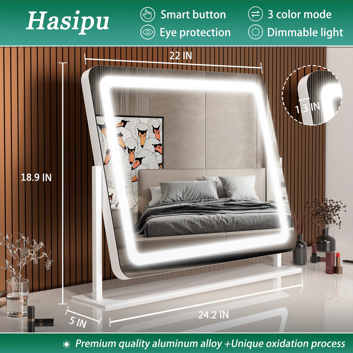 Q: What are the dimensions of the Hasipu Vanity Mirror with Lights?A: The Hasipu Vanity Mirror measures 24.2 inches in length and 18.9 inches in width, making it a perfect size for your makeup station.