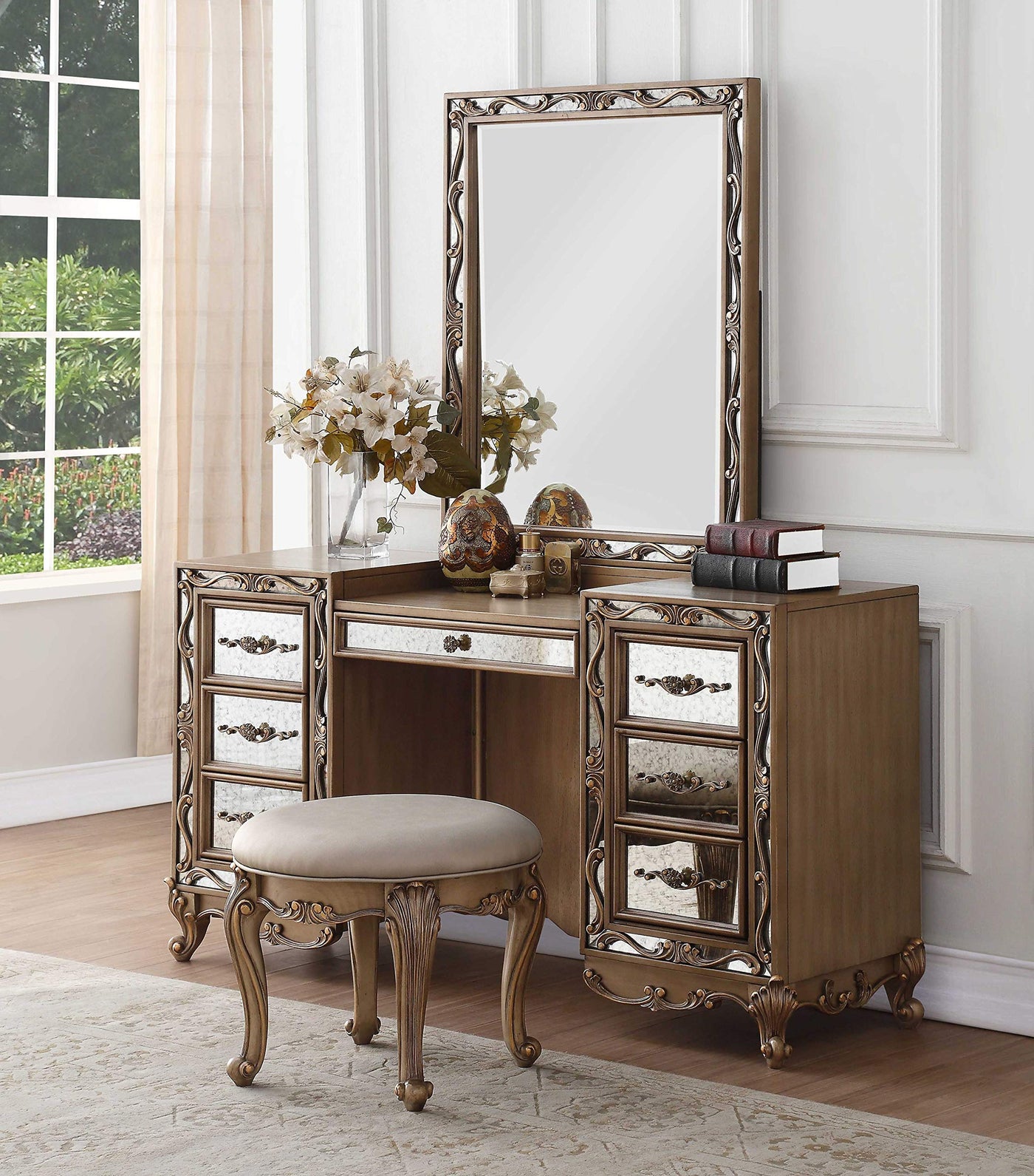 Antique Gold Wood Vanity Mirror This vanity mirror is exclusively designed and filled with romantic spirit A piece crafted and inspired by the luxurious designs of the past this gorgeous beveled mirror features raised floral molding accents and vintage mirror trim inlay with an antique gold finish Add glamorous vintage charm to your living space with this uniquely designed mirror that will make a statement in any bedroom Specifications. Color Antique Gold. Size 2 x 30 x 38 in. Material Wood Mirror. Country of Orgin Vietnam. Weight 37 lbs