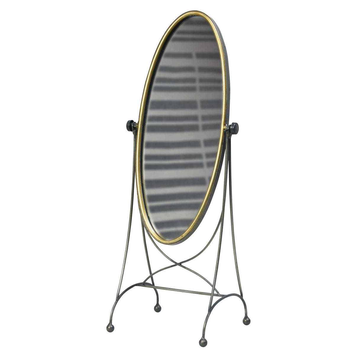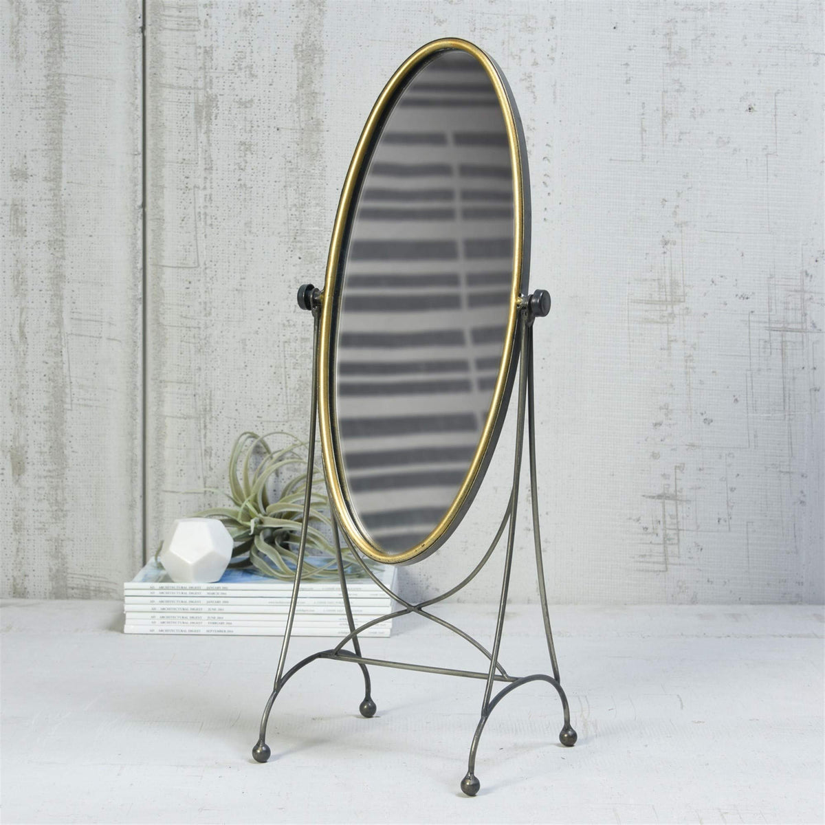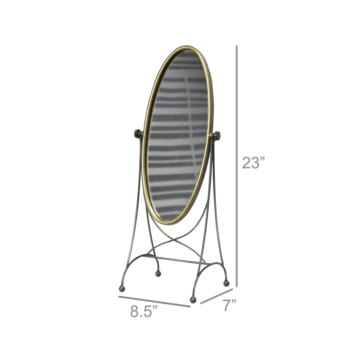 This minimalist styling with a touch of glam Gray and Gold Standing Oval Vanity Mirror is the perfect compliment to any bedroom This gold tone trimmed oval mirror sits on a base of gunmetal steel that gives a classic item a modern update Generous in size and stature the mirror swivels and angles to get the perfect look Ideal for bedroom bathroom countertop or vanity 23 x 7 x 85 Features. Gray Gold Oval Vanity Floor Mirror. Made from high quality materialsSpecifications. Shape Oval. Height 23 Inches. Width 7 Inches. Depth 85 Inches. Material Metal. Color Natural. Weight 26 lbs