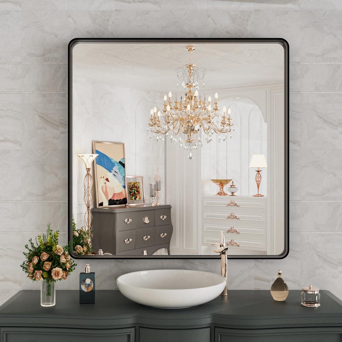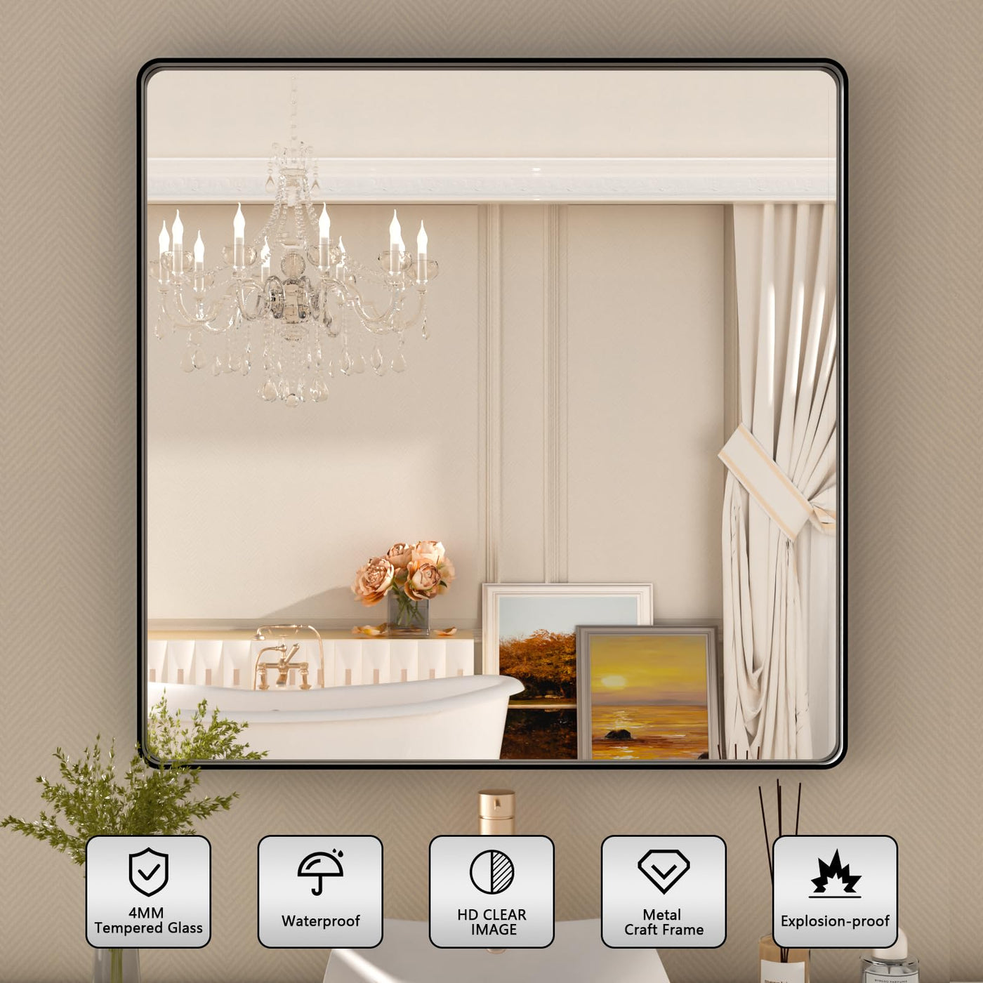 Q: Is the mirror made of durable materials?A: Yes, the mirror features a high-quality metal frame made from aluminum alloy, and it uses 4 MM safety tempered glass, making it shatter-proof and explosion-proof for added safety and durability.