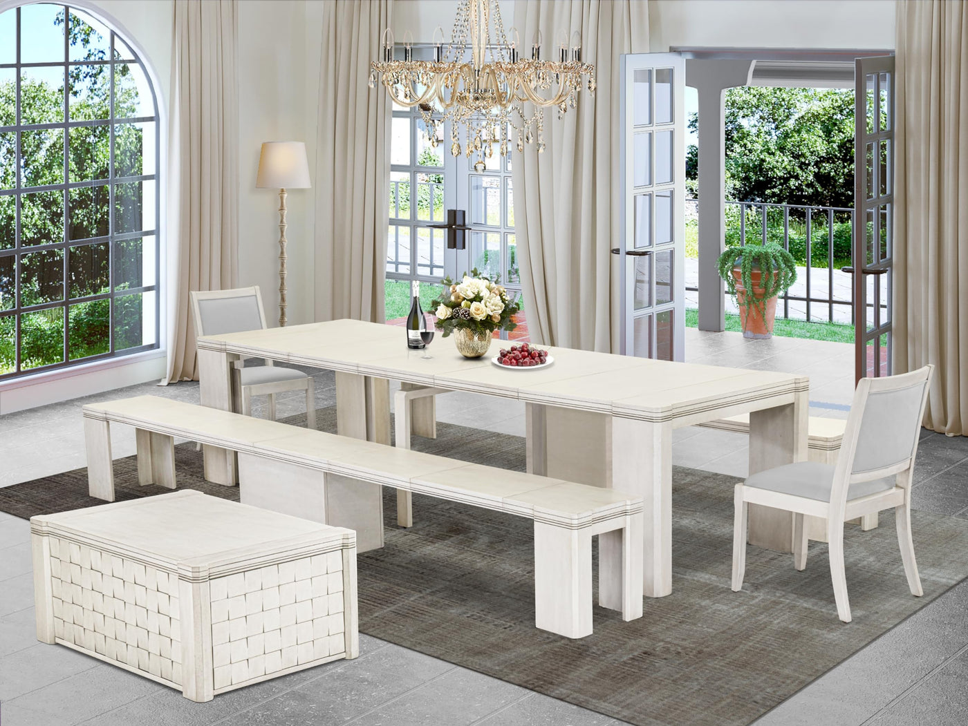 LUXE BY EAST WEST FURNITURE X02X2-2CW-27– 6-PIECE EXTENDABLE DINING SETDiscover the unparalleled elegance offered by Luxe by East West Furniture, our exclusive premium furniture brand, by delving into its diverse range of products. Luxe by East West Furniture proudly presents a 6-piece extendable dining set, comprising a transformer rectangular table, 1 coffee table, 2 extendable benches, and 2 stackable chairs. The extendable dining table offers the convenience of space-saving features. Our versatile table boasts an exquisite Antique White tabletop and legs, echoing the same Antique White finish found in the coffee table. The chairs offer comfort with generously padded backrests and Light Gray Faux Leather seats, elegantly complemented by Antique White chair legs. The benches are thoughtfully designed with comfortable Antique White Wooden seats. This extendable dining set is meticulously crafted from robust Acacia wood, ensuring enduring stability and exceptional durability. The transformer rectangular table, constructed from premium Acacia wood, is renowned for its exceptional strength and resistance. The Parsons Dining Chair effortlessly blends comfort and style with plush Faux Leather padding, enhancing any space's aesthetics.Product Features: Frame Material: Acacia Wood Tabletop: Rectangular Table & Bench Color: Antique White Chair Legs Color: Antique White Fabric Material: Faux Leather Fabric Color: Light Gray Chair Back: Padded Back Table Dimensions: Length: 120/19; Width: 39; Height: 30 Chair Dimensions: Length: 22.3; Width: 19.4; Height: 35.4. Bench Dimensions: Length: 131/29; Width: 15; Height: 18. Coffee Table Dimensions: Length: 42; Width: 28; Height: 19.Package Includes 2 Modern Benches, 2 Stackable Chairs, 1 Coffee Table, and an Extendable Dining Table.
