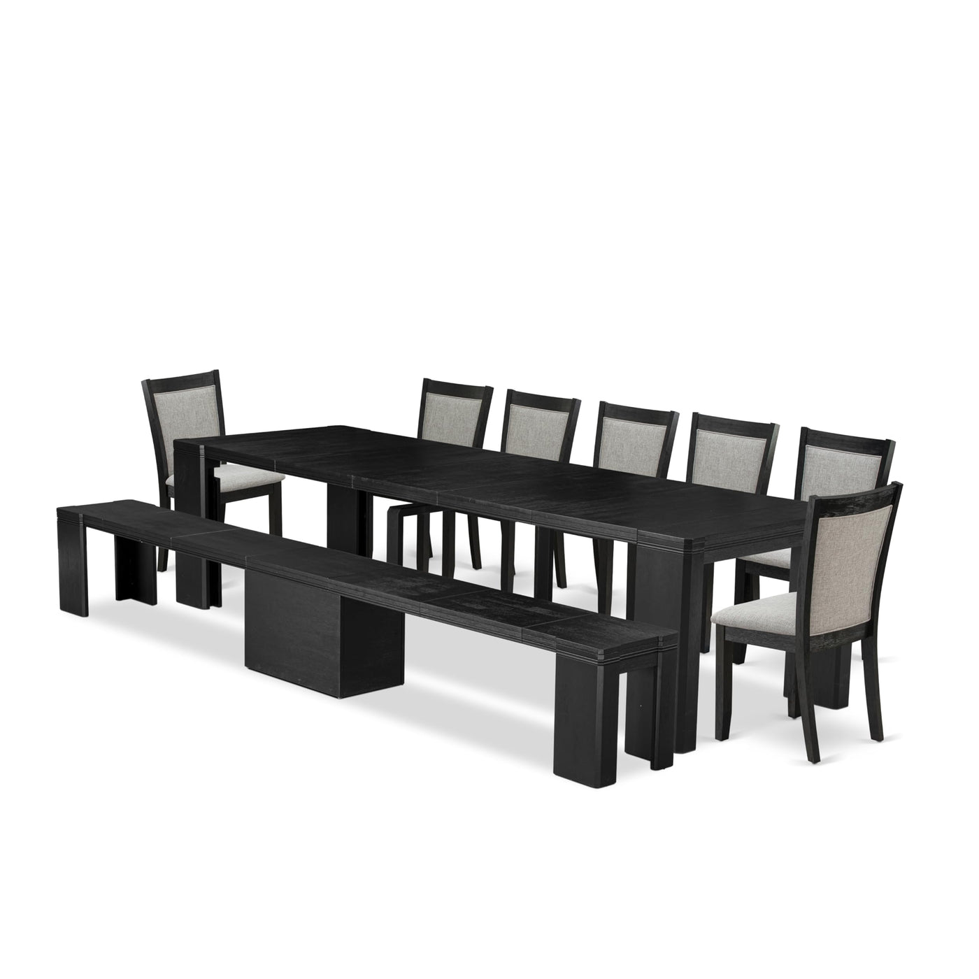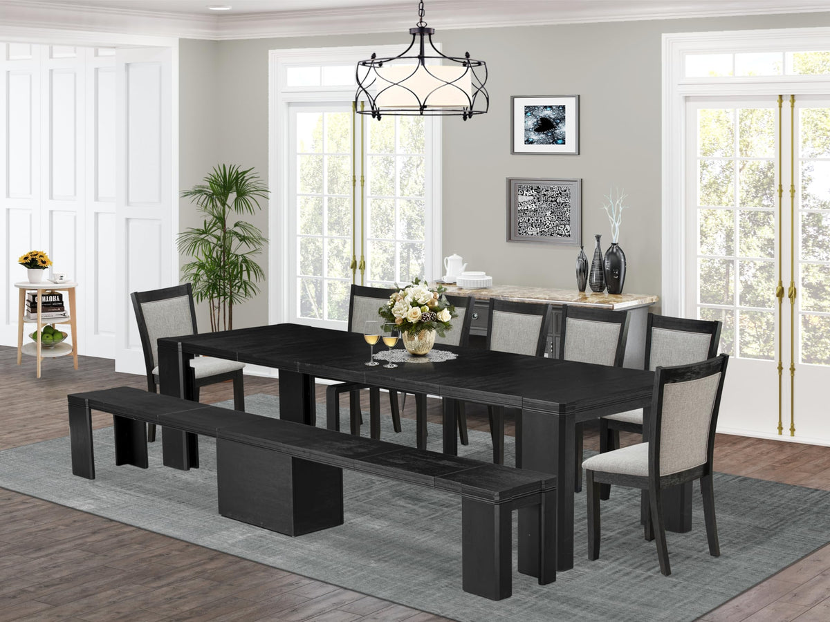 Luxe by East West Furniture - X07MZ-B06-06 - 9-piece Dining Room Table Set a Rectangular Dining Table with wooden Benches and 7 Shitake Linen Fabric Dining Chair, 39x120 Inch, Wire Brushed Black