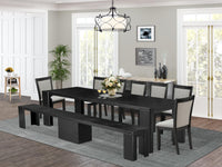 LUXE BY EAST WEST FURNITURE - X07MZ-B06-06– 9 -PIECE DINING ROOM TABLE SETExperience the unmatched elegance of Luxe by East West Furniture, our exclusive premium furniture brand. Explore Luxe and discover the 9-piece Extendable Dining table set, which includes a expandable dining table, wooden bench, and 7 upholstered dining chairs. The upholstered dining chairs provide added comfort to any dining room, featuring a Wire Brushed Black tabletop and chic shitake Linen Fabric upholstery. These dining chairs boast a stylish wire brushed black finish, crafted from high-quality Acacia wood, ensuring excellent load-bearing capacity and stability. The modern kitchen chairs prioritize comfort with Linen Fabric seats and slatted backs. Plus, a transformer table allows effortless size adjustments to meet varying needs. All accessories come conveniently packaged in a carton with easy-to-follow instructions for swift chair installation. Maintain their pristine condition by wiping the chairs clean before use. Experience Luxe by East West Furniture's sophistication today.PRODUCT FEATURES: Material: Acacia Wood Frame Color: Shitake Table and Bench top color: Wire Brushed Black Chair Legs Color: Wire Brushed Black Chair Back Style: Padded Chair Table Dimension: Length: 120/19; Width: 39; Height: 30. Chair Dimension: Length: 19.5; Width: 17; Height: 36.8. Bench Dimension: Length: 131/29; Width: 15; Height: 18.Included packages: A rectangular table and 7 kitchen chairs, a wooden bench