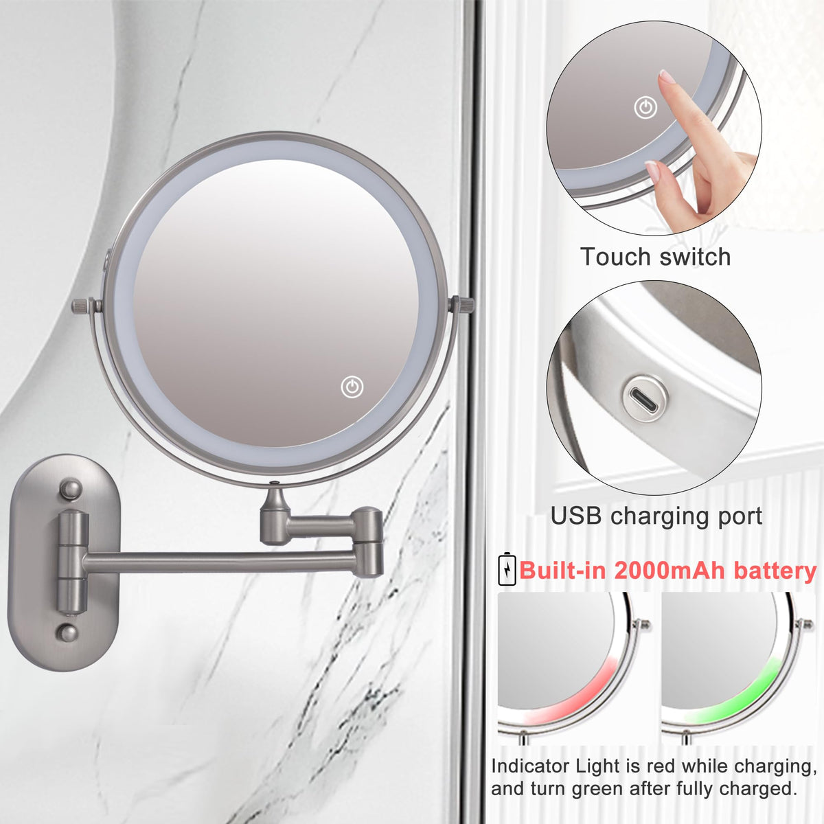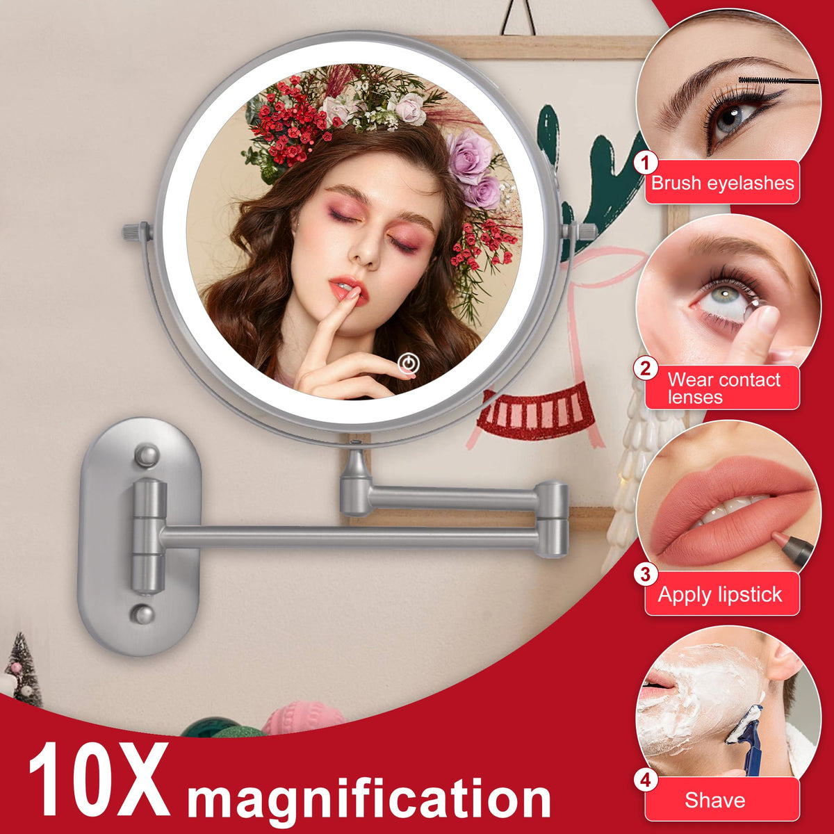 Rechargeable Wall Mounted Lighted Makeup Vanity Mirror With 10X/1X Magnification For Shaving, 8Inch Brushed Nickel Magnifying Mi