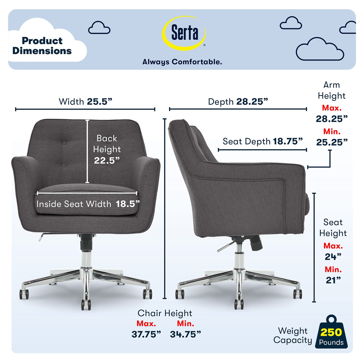 The Better You Sit, The Better You'Ll Feel. Whether For Work, Play, Or Any Other Activity That Has You Sitting In Our Chairs, We Believe Comfort Is Everything. We Know It'S A Big Responsibility And Take It Seriously, Just As We Do With Our Mattresses. With Over 15 Years Of Making Chairs And Innovating With Designs, Materials, And Technology, Serta Knows What It Takes To Give You A Comfortable Sit. With Its Chic, Mid-Century Modern Design, The Ashland Is A Trendy Desk Chair That Adds A Touch Of Style And Inspiration To Any Workspace, Whether You'Re Working From Home Or Clocking In Hours At The Office. It Reimagines Retro And Vintage Accent Chairs With Its Boxy Mid-Back Silhouette, Low-Slung Arms, And Sophisticated Button-Tufted Details For A Nostalgic Yet Modern Look. The Ashland Is Not Only Stylish With Its Designer Aesthetic But Also Practical As A Comfy Vanity Chair Or Teen Desk Chair For The Bedroom Or Study Room. Upholstered In Durable Twill Woven Fabric Or Bonded Leather In 11 Colors, You Can Complement Your Home Decor With A Classic And Timeless Appeal Or A Splash Of Color For A Cute And Playful Touch. This Decorative Office Chair Delivers Surprising Comfort. The Fixed, Padded Armrests And Memory Foam Seat Cushion Let You Sit Comfortably With Adequate Ergonomic Arm Position, While The Mid-Back Is Well-Cushioned And Provides Limited Support. The Sturdy Stainless Steel Base Supports Up To 275 Lbs And Rolls On 360º Dual Castor Wheels, Ideal For Rugs And Carpet Floors. An Adjustable Seat-Side Lever Lets You Match Your Chair Height To Your Size And Work Setting, While The Low-Profile Arms Easily Slide Under Most Desks For Easy Storage. Refresh Your Workstation And Choose The Serta Ashland Office Chair For A Fashionable And Functional Deskmate That'Ll Transform Any Dull Room Into A Fabulous Workspace.