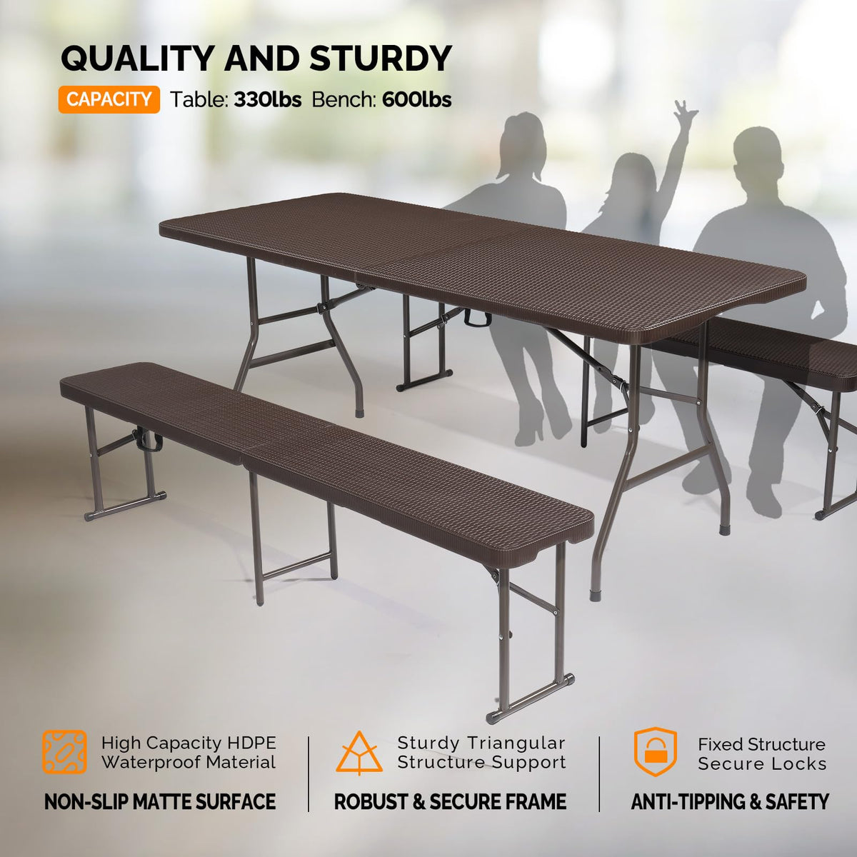 Vingli Picnic Table Set With 2 Benches, 6 Feet Camping Table Chair Set, 3-Piece Folding Furniture For Indoor Or Outdoor Use, Rattan Patterned Tabletop, Brown