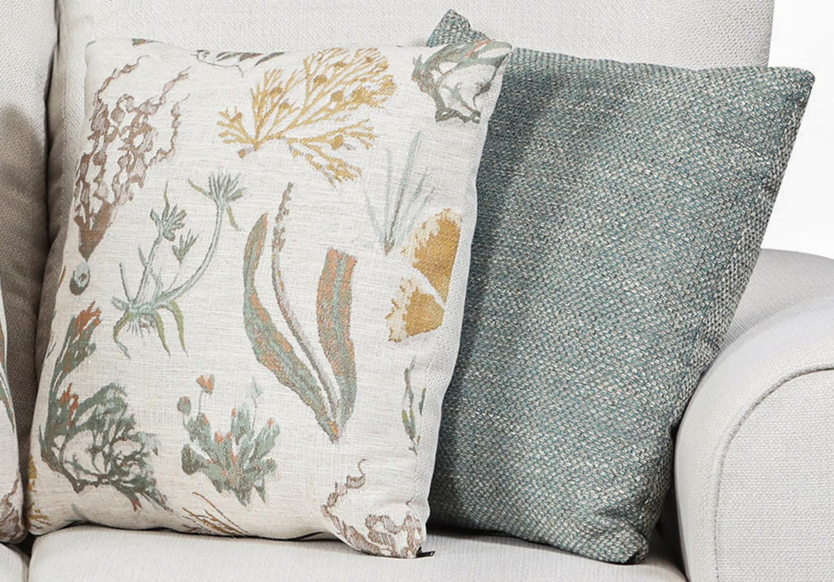 Our Beaujardin Rounded Arm Sofa features a beautiful 100% Polyester Soft Washed Tweed Fabric. The cleaning code on this fabric is soap and water. Solid wood frames and legs create a product that will last for years. Fiber wrapped, high density foam cushions offer a soft but supportive seating experience. Both the seat cushions and the back cushions are removable. Also included are four beautiful double sided pillows with welt piping. Two of the pillows are a teal tweed on both sides and two of the pillows have the teal tweed on one side and a beautiful tan seashell tapestry on the other side.
