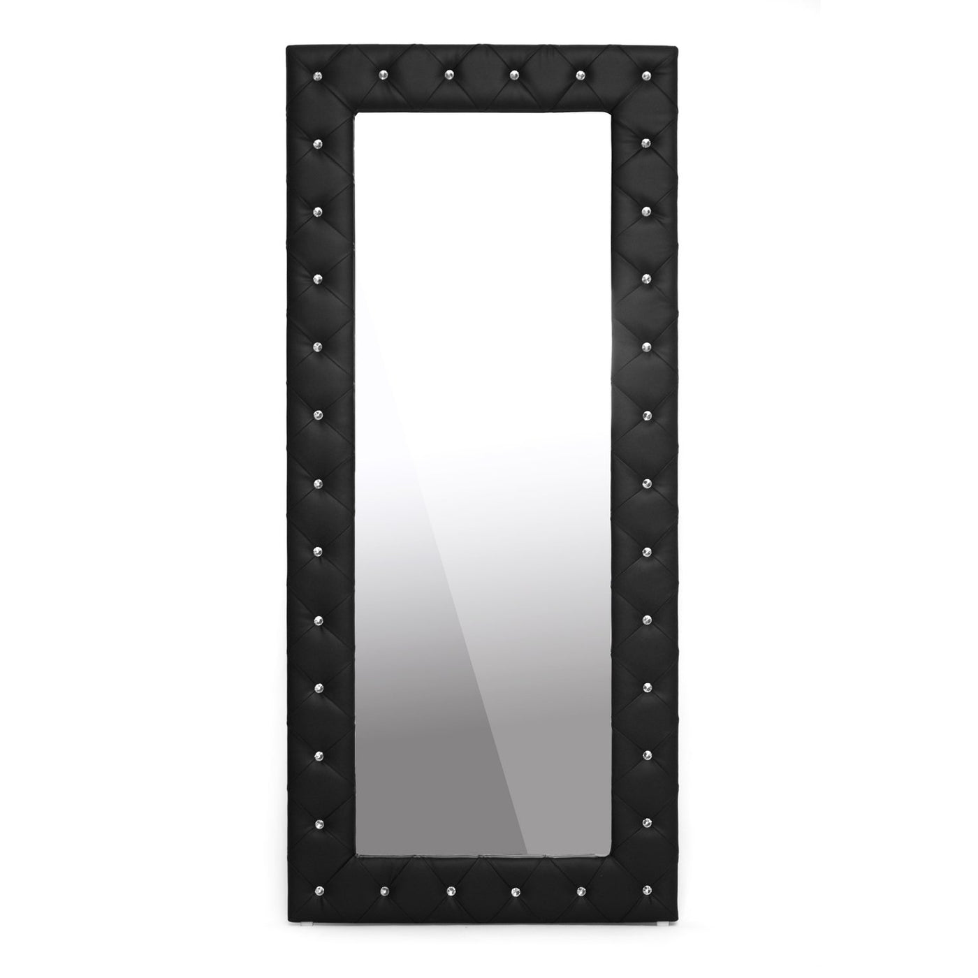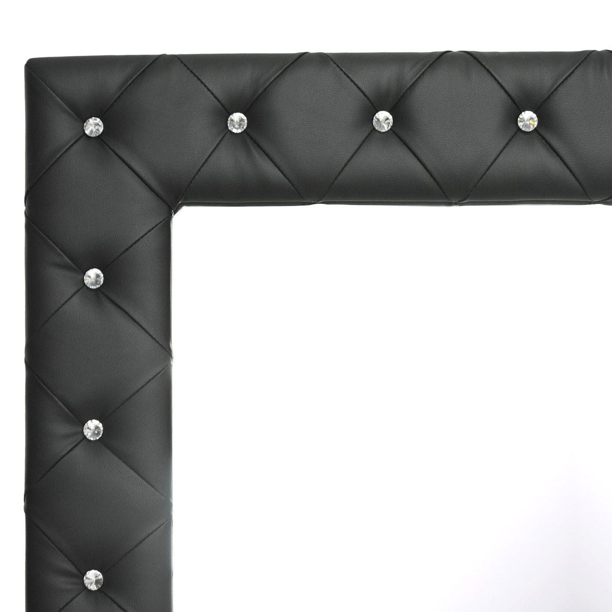 Stella is a glamorous designer floor mirror that takes it up a notch with allover faux crystal button tufting. Plentiful crystal lookalike buttons adorn every nook and cranny of the frame and truly glimmer with even the slightest bit of light. White faux leather covers a sturdy rubber wood frame topped with foam padding. The Malaysian-made designer floor mirror, which is fully assembled, is also available in black (sold separately). Keep an eye out for the matching bed and bed-end bench (each sold separately). To clean, wipe with a damp cloth. Internal Size: 60 Inch high x 20.5 Inch wide Dimensions: 71.25 Inch high x 31.25 Inch wide x 1.5 Inch deep.