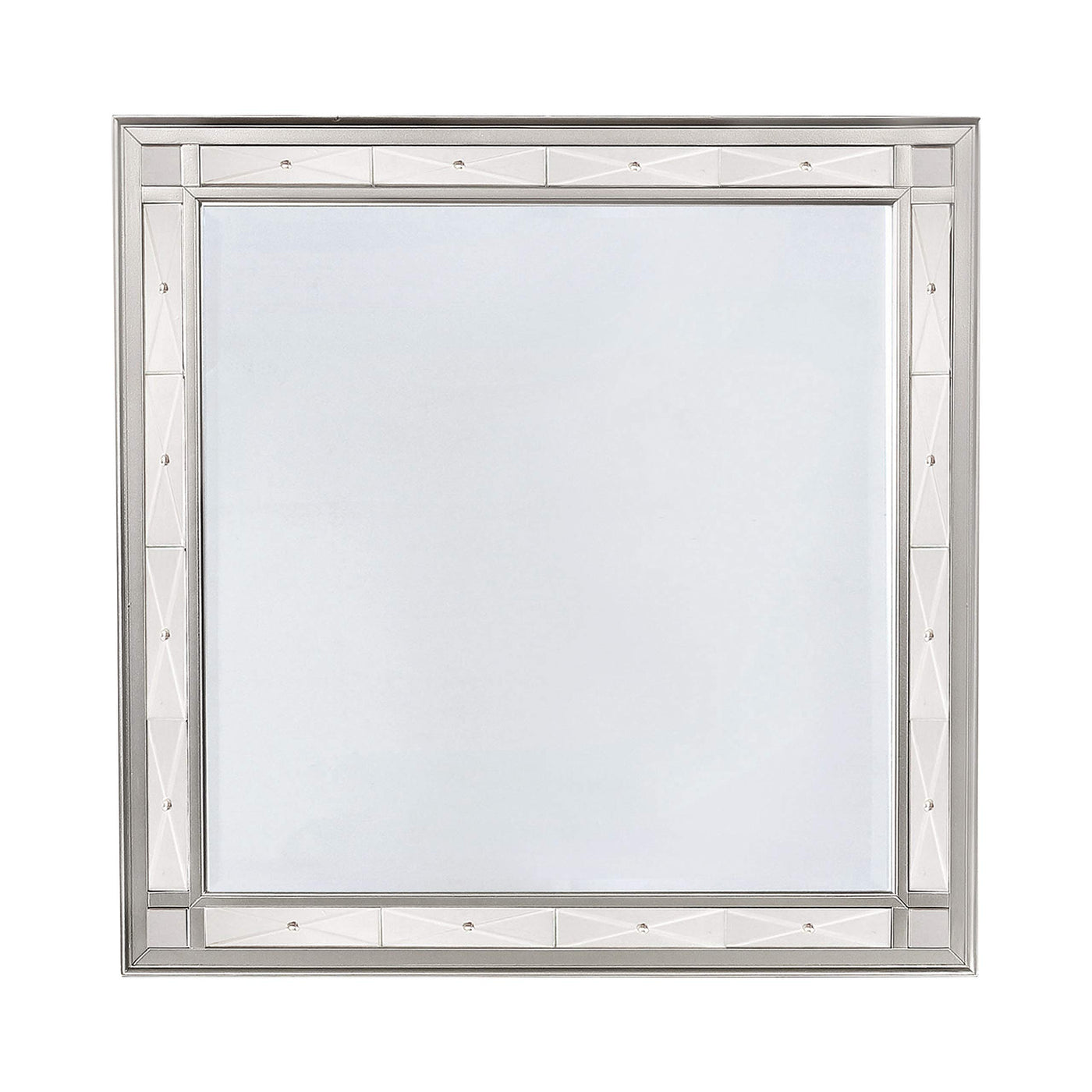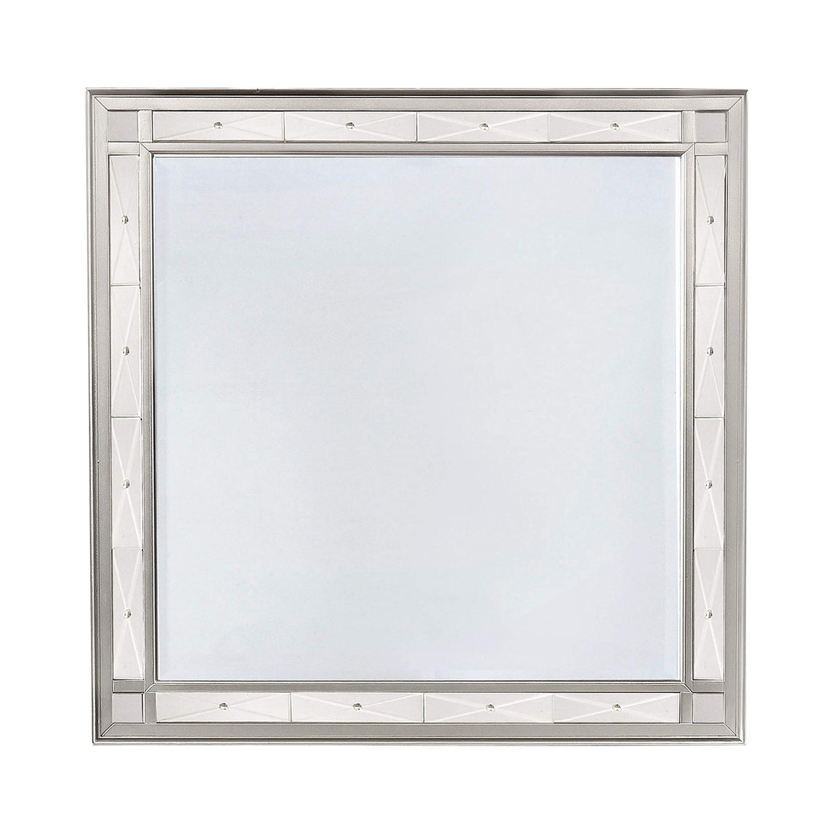 This coaster Leighton modern mercury metallic beveled dresser mirror measures 40.5" length, 1.5" Width, 40.75" Height. Get all dolled up in front of this sophisticated dresser mirror with beveled edge. From the Leighton collection exclusive to coaster furniture, this square mirror exudes elegance in its Metallic Mercury finish and etched mirror panels accenting the framework. Prepare for the red carpet and look fabulous in this modern dresser mirror.