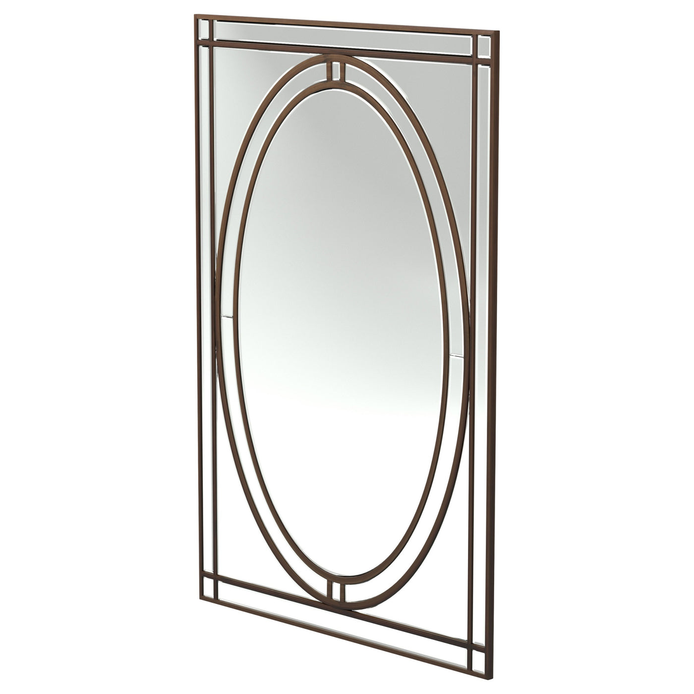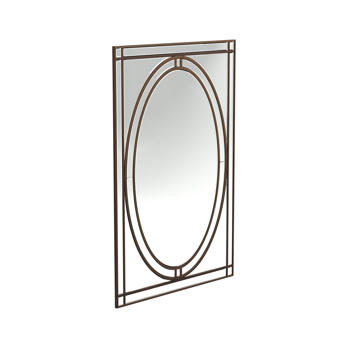 Perfect for a transitional style home, this lovely wall mirror features a frame overlay in a striking, warm gold finish. The thin frame consists of a rectangular outer edge with an oval shaped frame in the center. Between each are mirror tiles with classic bevelled edges. Hang this mirror in a dark room to reflect some sunlight. You can also hang it in an entryway foyer or above a console or dresser.