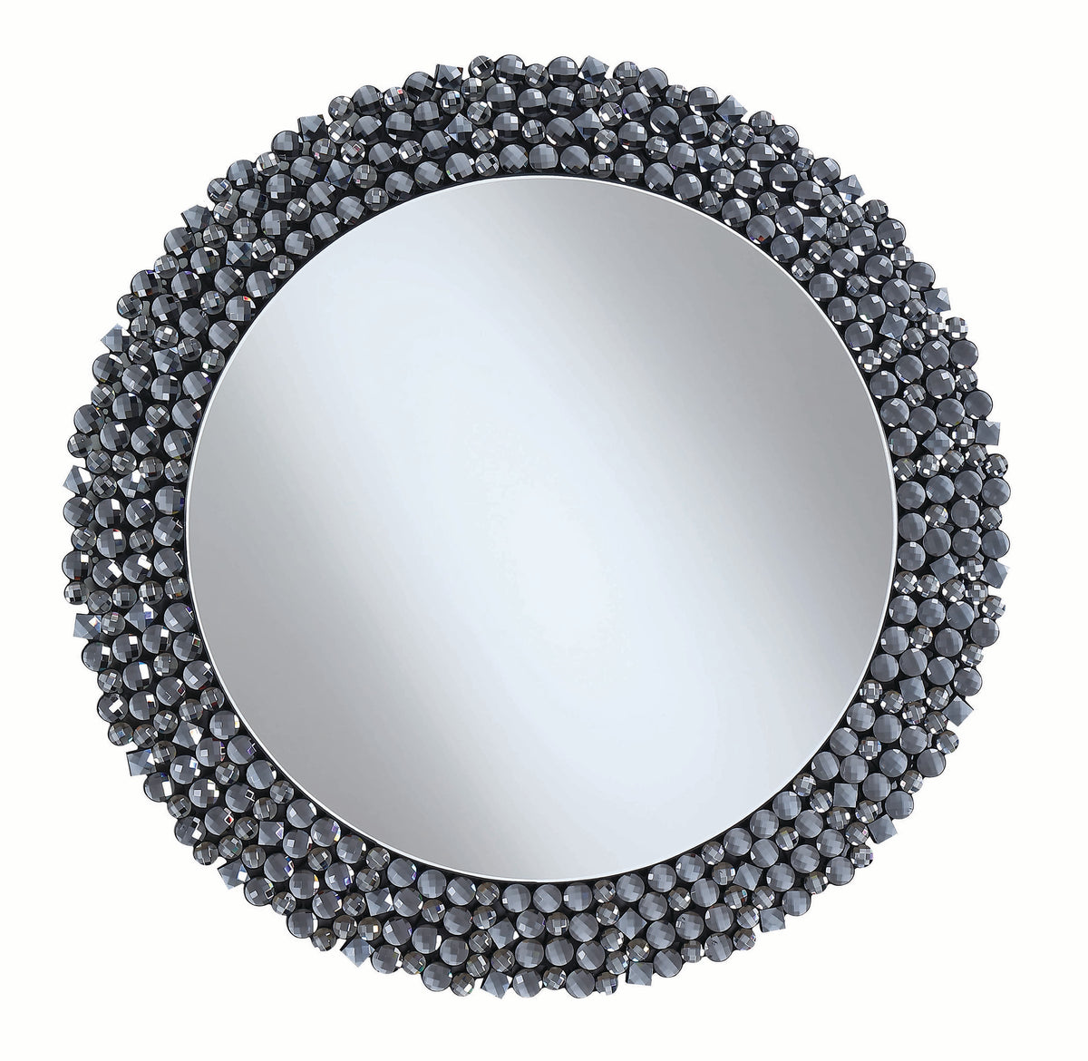 This Coaster Contemporary Silver Round Wall Mirror measures 31.5" length x 0.75" width x 31.5" height. With a glam-inspired design, this contemporary wall mirror shows off a lovely circular shape. The outer rim sports a grey geometric bead design that will bring visual intrigue to your space. Hang for decorative purposes, practicality, or both!