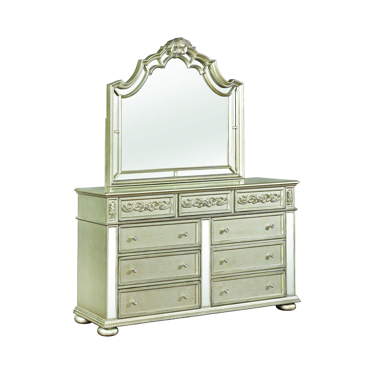 Embrace your glamorous side with this luxe mirror from the Heidi collection. This mirror presents an iconic bombe shape, perfectly mimicking the bed frame from this same collection. The metallic platinum finish boasts of Hollywood glam, accented with mirrored panels within the ornate frame. Wood carved details adorn the frame for a traditional silhouette. Perfectly complements the dresser from this collection, easily attaching for the finishing touch.