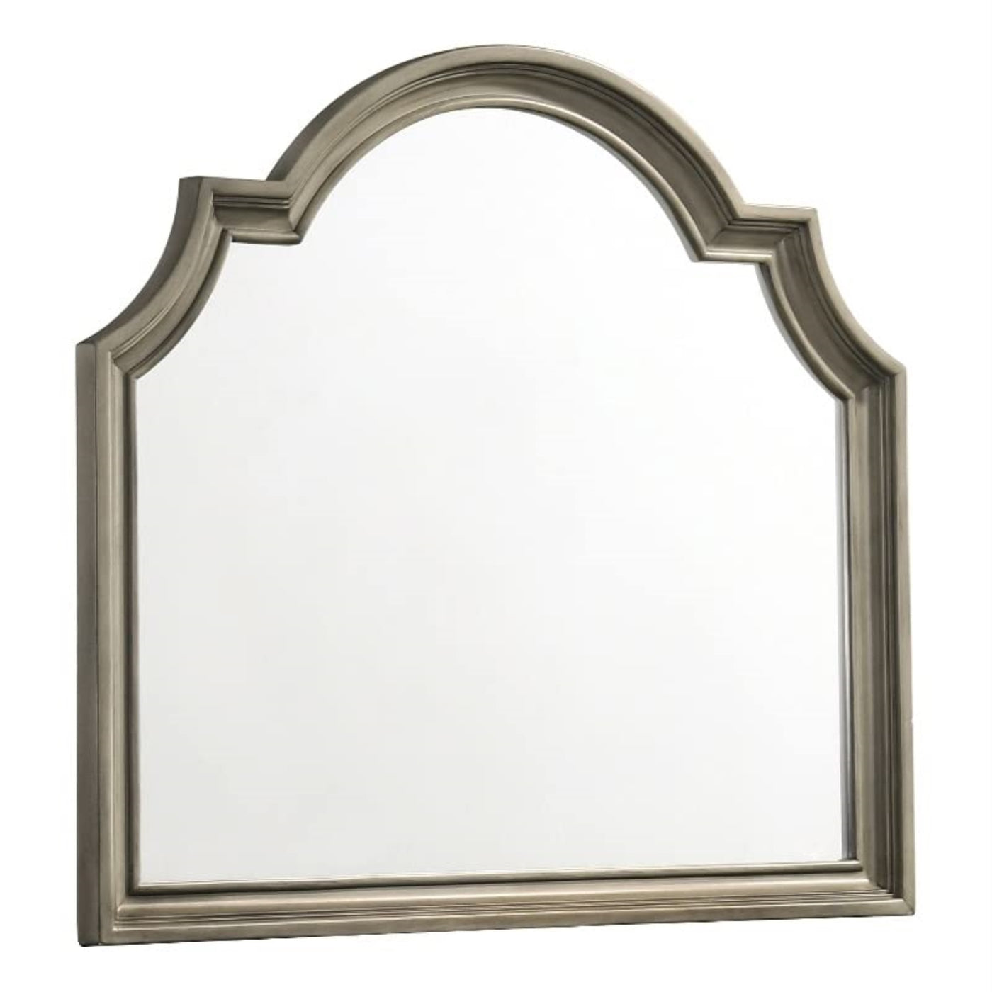 Elegant curves add style and grace to this traditional mirror. Framed in dimensional wood molding with a gray undertone wheat finish, this classy mirror lends itself to existing color palettes in your bedroom setup. This arched mirror is elevated by a scalloped bonnet design that offers a more sophisticated style to a timeless classic. Perfect for adding height to a dresser to create a focal wall, this arched transitional mirror is sure to catch the eye. Attach it to a matching dresser available in the Manchester bedroom collection to complete your restful retreat.