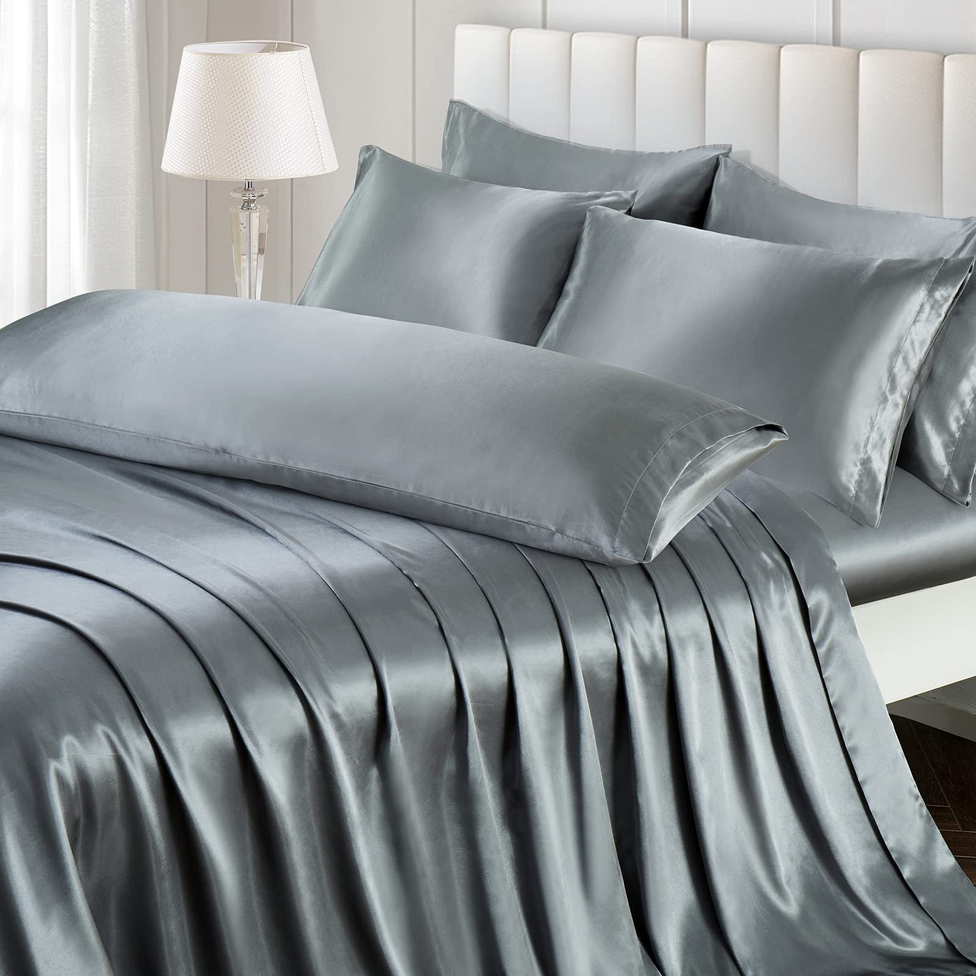 Ersmak 7 Pieces Satin Sheets Set Queen Size, Luxury Silky Grey Satin Bed Sheets Set With 1 Deep Pocket Fitted Sheet, 1 Soft Flat