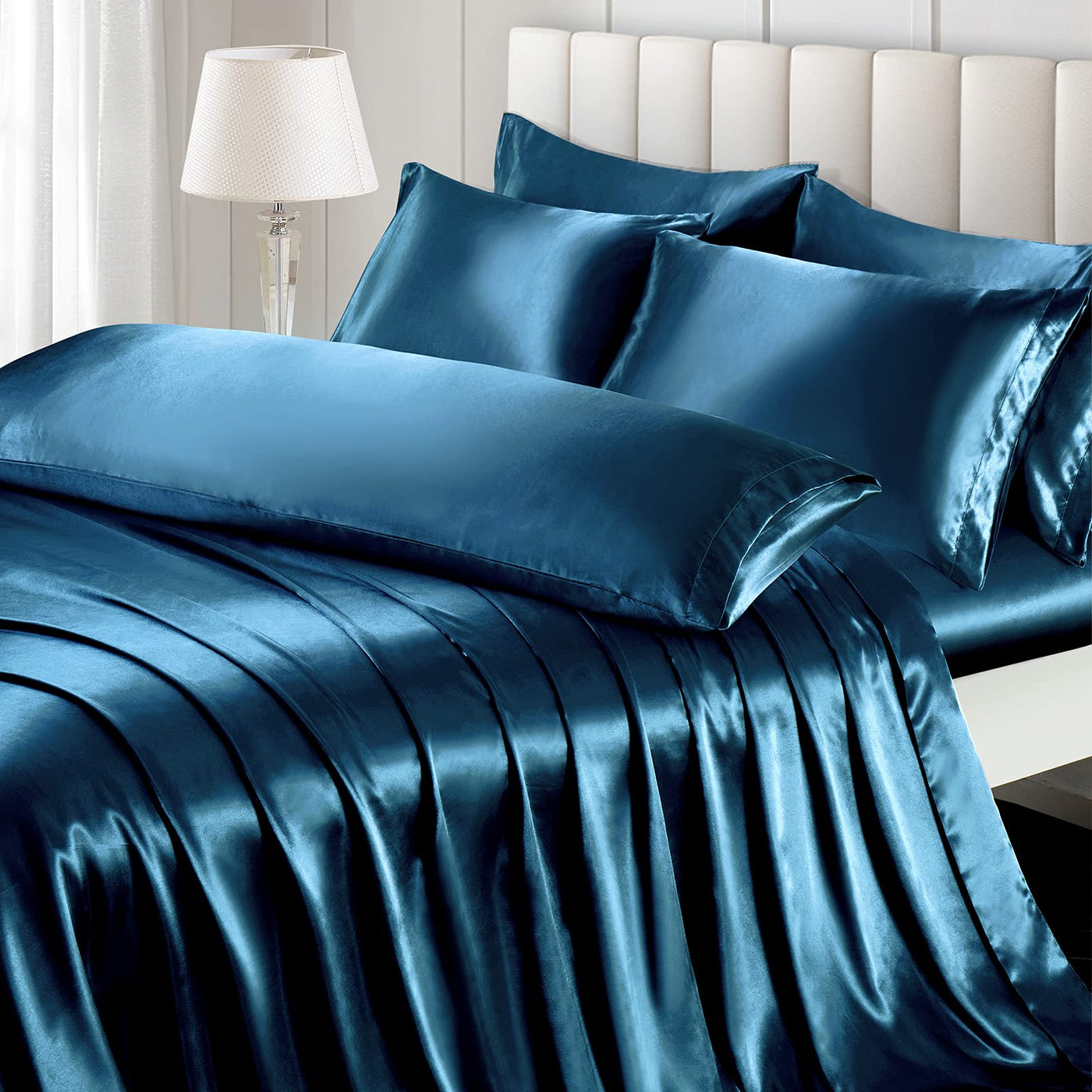 Ersmak 7 Pieces Satin Sheets Set Queen Size, Luxury Silky Navy Blue Satin Bed Sheets Set With 1 Deep Pocket Fitted Sheet, 1 Soft