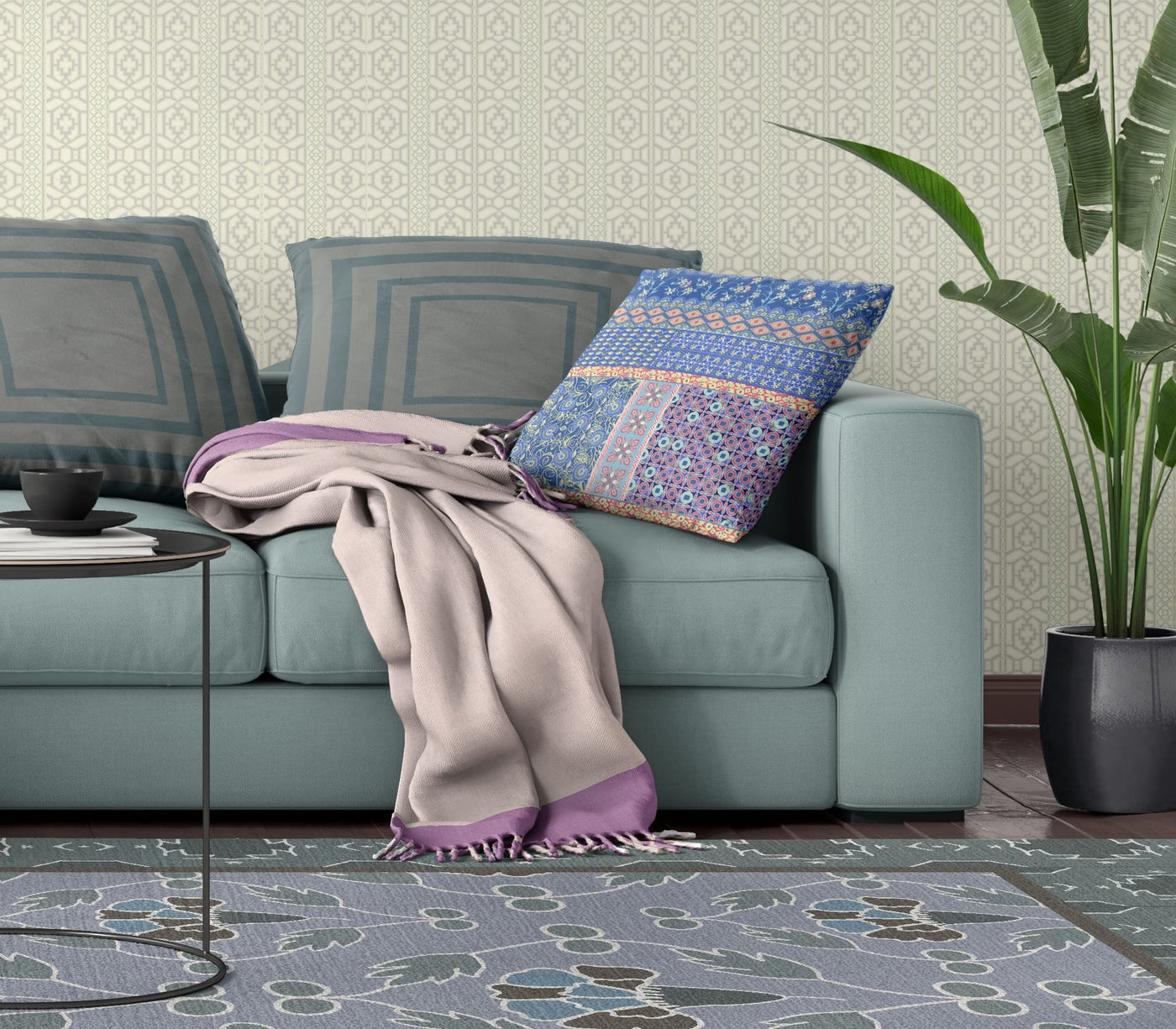Merging botanic elements with fine modern linework, this sophisticated Blue Yellow Patch Indoor Outdoor Throw Pillow assures a boho-chic essence into your living space. The enchanting pops of pale yellow floral vines and geometric motifs on the neon blue base create a subtle contrast, while the use of pastel pink adds to visual harmony. Crafted from finest broadcloth fabric that ensures longevity and sturdy construction hence suitable for indoor and outdoor use. Fluffy in nature, this blown and closed pillow is stuffed with a durable polyester filling which gives you a cushiony feel to lean on comfortably. You surely want to opt for this decorative pillow to set a calm and relaxing ambiance into your living space. 18'Â x 18'Â x 5'Â