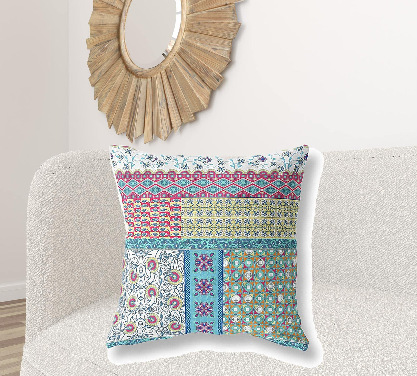 Enliven your living space with pops of colors and eye-catching patterns with this White Yellow Patch Indoor Outdoor Throw Pillow. Showing off beautiful patchwork in eclectic floral and geometric patterns, this pillow creates a stunning combination of cool-toned cyan, pink, and white with warm yellow to give this pillow a playful vibe. Made from premium quality broadcloth fabric that is known for its durability to last long, while the smooth and plush texture offers a characteristic sheen. This blown and closed pillow is finished to perfection with a soft polyfill insert, making it ideal for outdoor and indoor use while maximizing comfort. Enhance the aesthetics of your boho-chic living space with this alluring decorative pillow flaunted on the sofa or couch. 28'Â x 28'Â x 5'Â