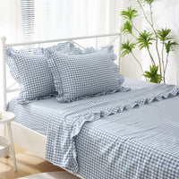 K Masaniji Dust Blue White Plaid Ruffle Sheets Twin Size 4-Piece Set, 300Tc 100% Yarn Dyed Cotton Sheets18 In Deep Pocket Preppy