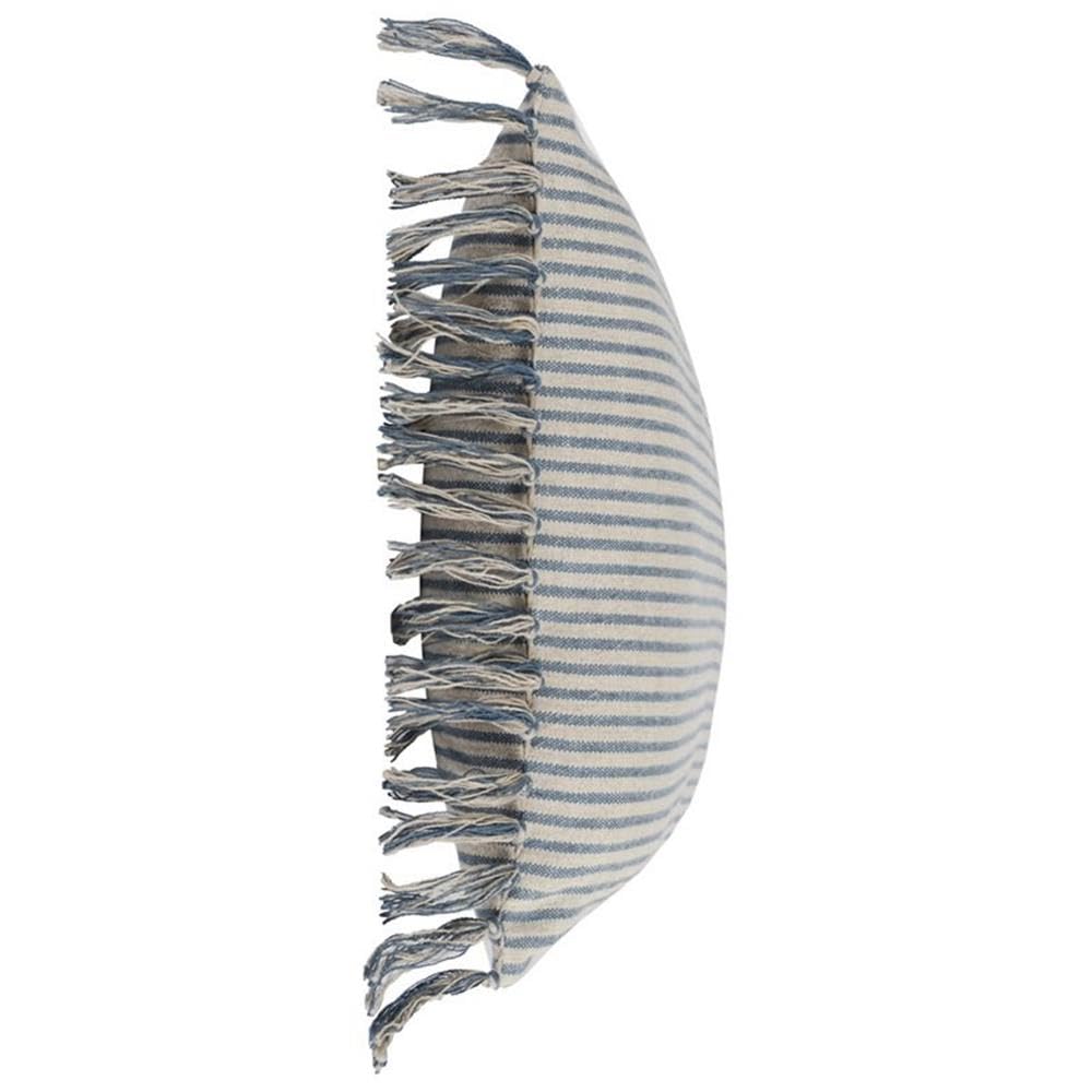 - Materials: 50% cotton, 50% linen - Finish: Blue, natural - Woven stripe design - Self knotted tassels on the sides - Luxury feather & down insert - YKK hidden zipper - Same fabric and design on front and back.