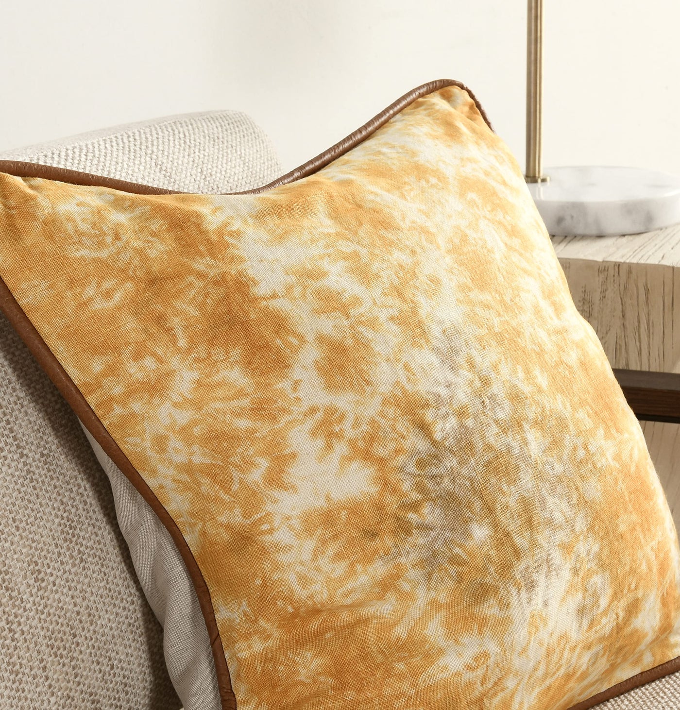 Each Nester pillow is individually hand dipped in saltwater tie-dye. This technique creates a unique pattern in each pillow making each one a true one-of-a-kind piece. The exposed silver nickel zipper closure and genuine leather piping give this casual look a chic finish.