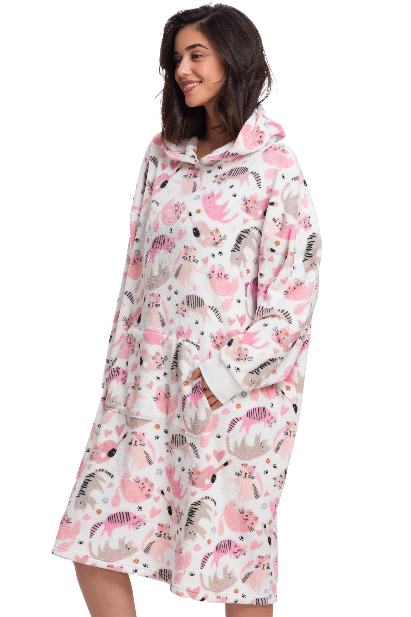 Mad Dog Sherpa Fleece Wearable Blanket Hoodie For Adult Women With Long Sleeves, Cozy Hooded Poncho Jacket, Cats