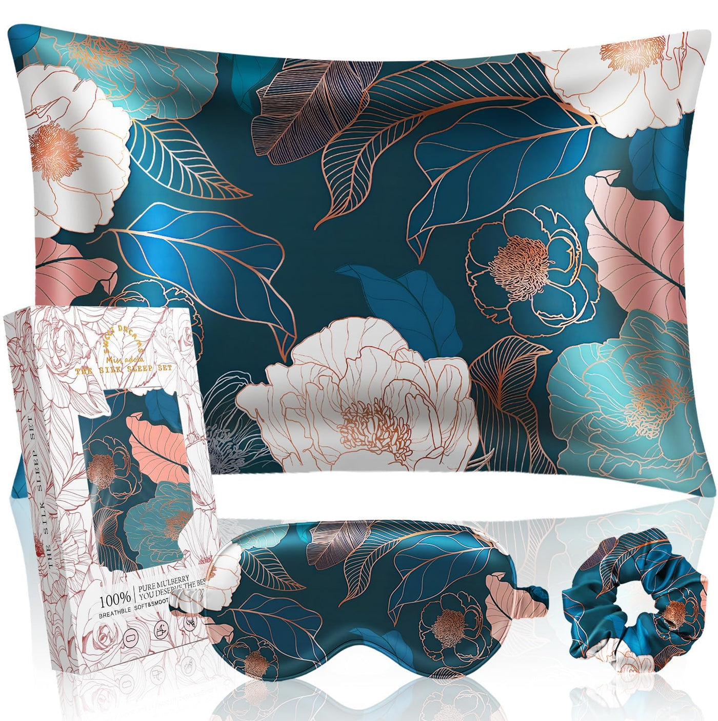 Miss Adola Mulberry Silk Pillow Case For Hair And Skin 19 Momme Standard 26'X20' Dark Blue Peony Silk Pillowcase With Eye Mask