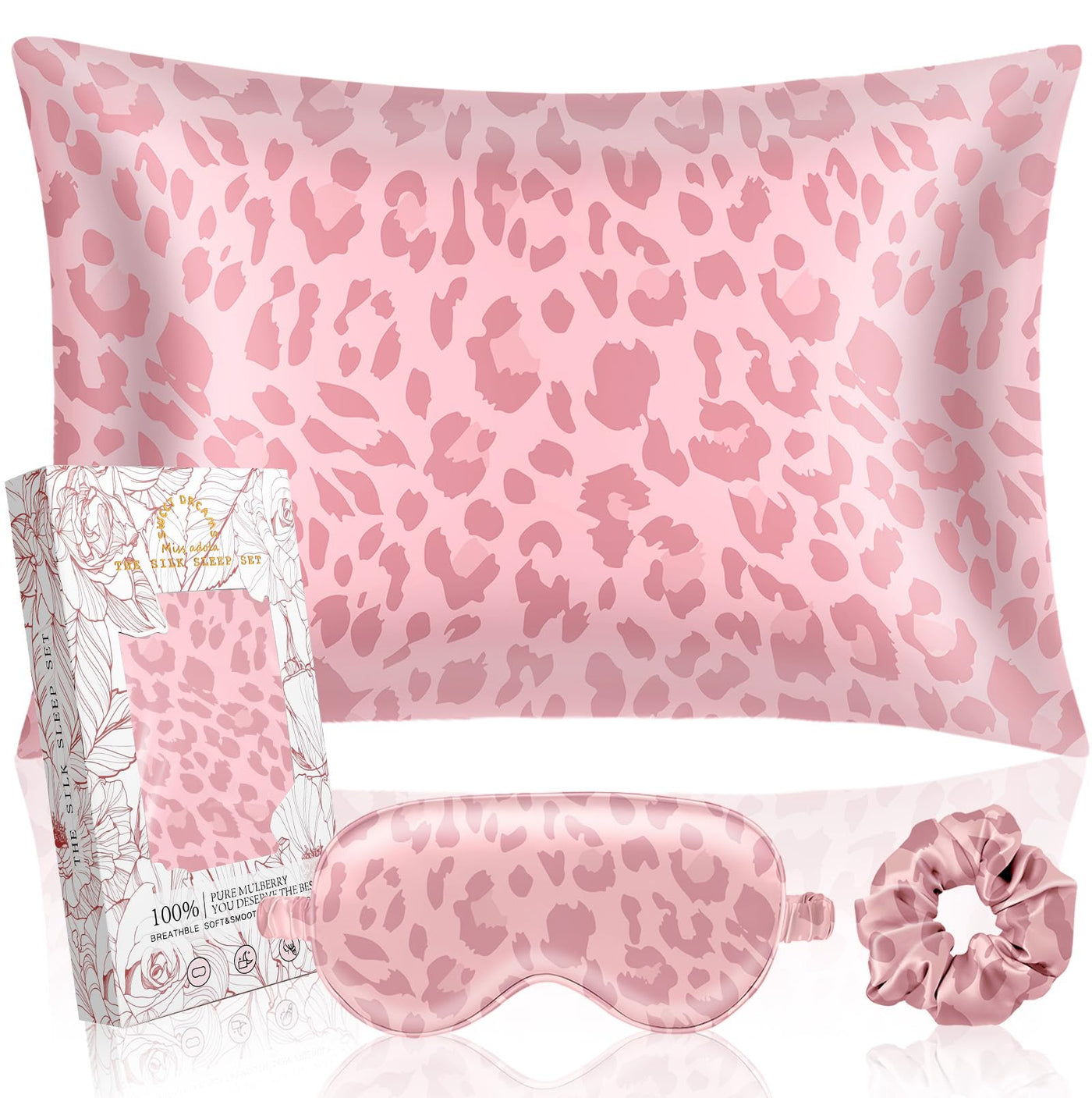 Miss Adola Mulberry Silk Pillow Case For Hair And Skin 19 Momme Standard 26'X20' Pink Leopard Satin Pillowcase With Eye Mask & Scrunchie Soft Satin Pillowcase Sleeping Gifts For Moms, Women