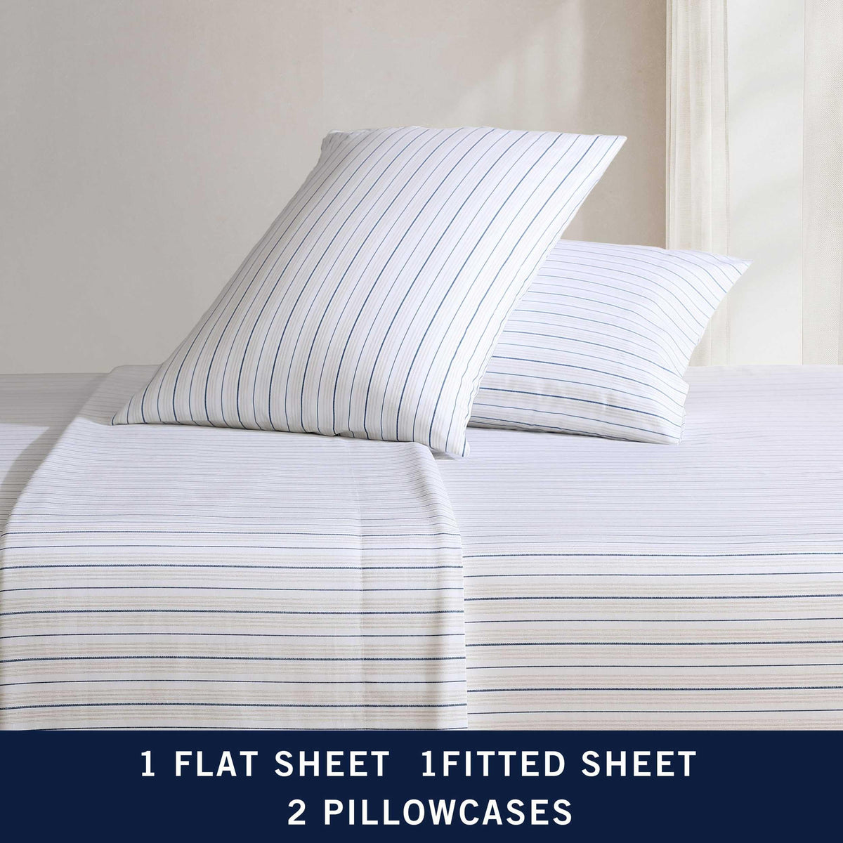 Update your bedroom decor with a new printed cotton percale sheet set from Nautica. Available in an array of stylish Nautical designs and solid colors, these 200 thread count sheets will add an extra layer in your bedding that is cool to the touch. Breathable and lightweight, this cotton construction is perfect for long-lasting comfort. Each sheet set includes one flat sheet, one fitted sheet, and two pillowcases (one for twin and twinxl sizes). The fully elasticized fitted sheet prevents slipping from the mattress and ensures the perfect fit. This set fits mattresses up to 18' deep (15” deep for twin sizes). This set is machine washable for easy care.