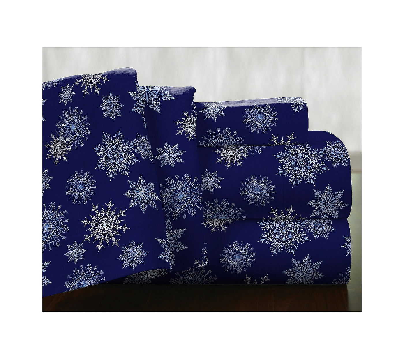 Pointehaven Flannel Deep Pocket Set With Oversized Flat Sheet, King, Snow Flakes Navy