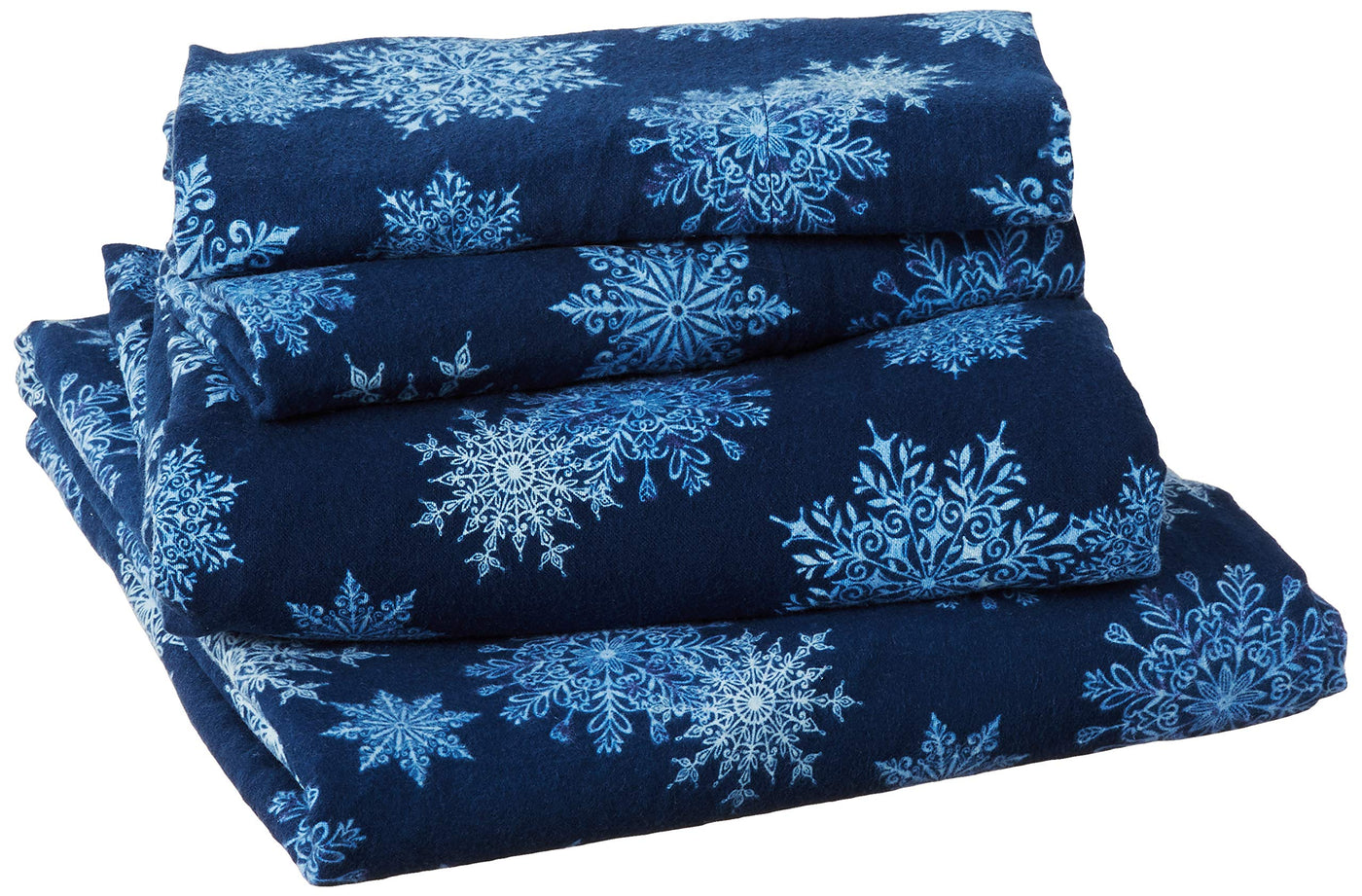 Pointehaven Flannel Deep Pocket Set With Oversized Flat Sheet, Queen, Snow Flakes Navy