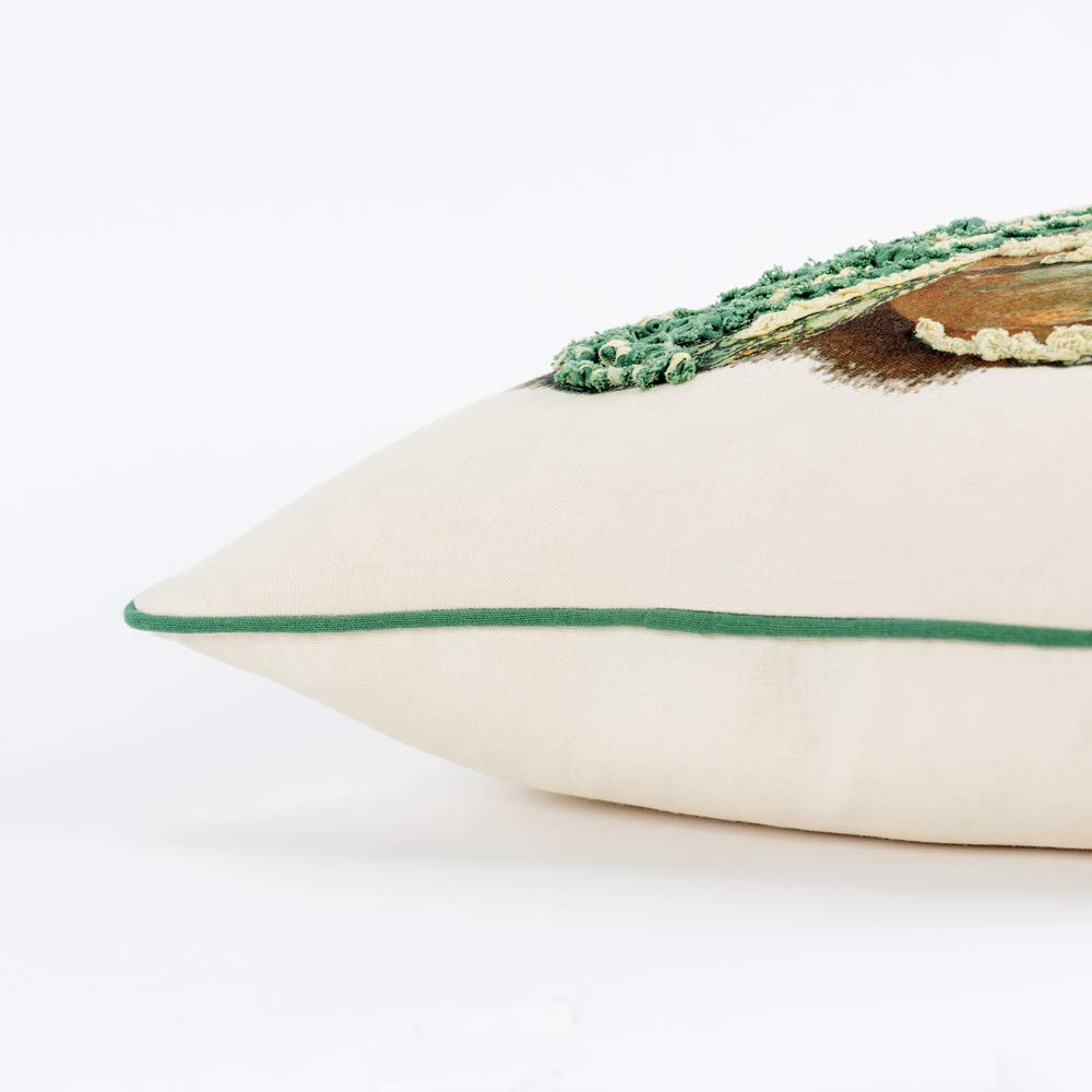 - Size: 20 x 20 - Hand Screen Printed - Heavy Embroidery - Heavy Texture - Contrast Welted - Hidden Back Zipper Closure - Spot Clean Only.