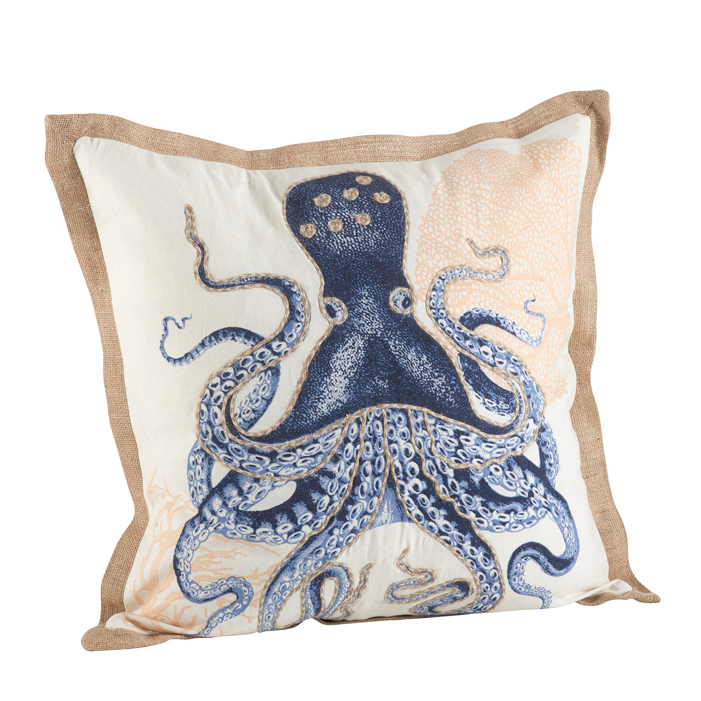 Elevate Your Sea-Inspired Space With This Down-Filled Cotton Pillow From Saro Lifestyle, With An Elaborate Octopus Illustration Framed By Burlap Trim.