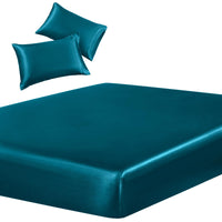 Siinvdabzx 3-Piece Set Satin Queen Fitted Sheet & 2 Pillowcase, Dark Teal Silky Soft Fitted Bottom Sheet, Wrinkle Free, Fade Res