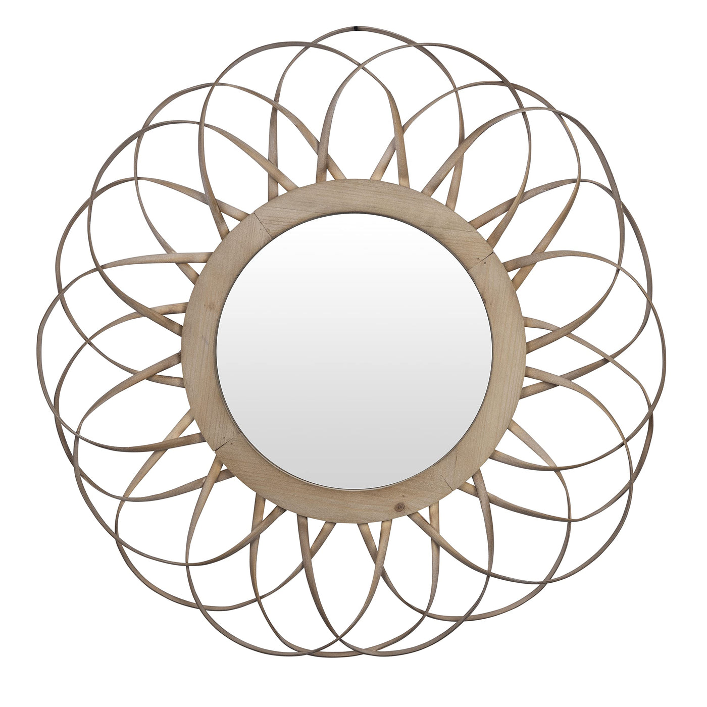 Impress guests with your love for boho-themed interior design. This curved wall mirror features a flower-themed, layered wood frame. It shows off an attractive slight white-washed finish, topped off by visible grain and knot details for accent.